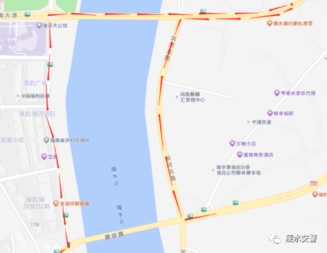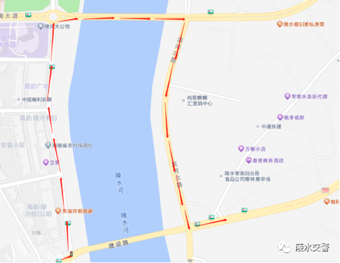 2023年3月18日9:00至16:00时段,封闭陵水大桥滨河北路至滨河南路方向行车道及人行通道。车辆绕行路线为:滨河北路→椰林北大道→椰林大桥→滨河南路(如图2所示)。
