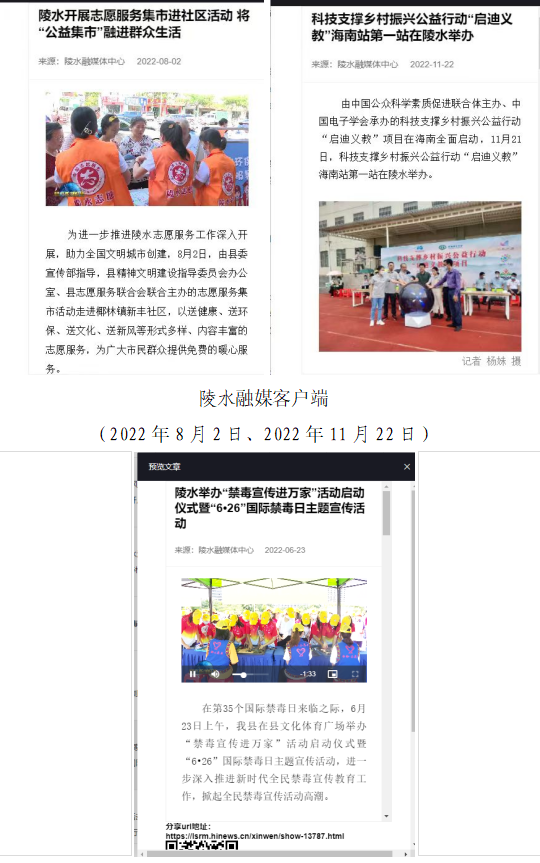 开展脱贫攻坚先进人物、爱心公益、文明城市创建、禁毒等方面的宣传,弘扬时代主旋律,传播积极向上的内容,策划播出《科技支撑乡村振兴公益活动“启迪义教”海南站第一站在陵水举办》《陵水开展志愿服务集市进社区活动 将“公益集市”融进群众生活》《陵水举办“禁毒宣传进万家”活动启动仪式暨“6.26”国际禁毒日主题宣传活动》等新闻,获得群众点赞。