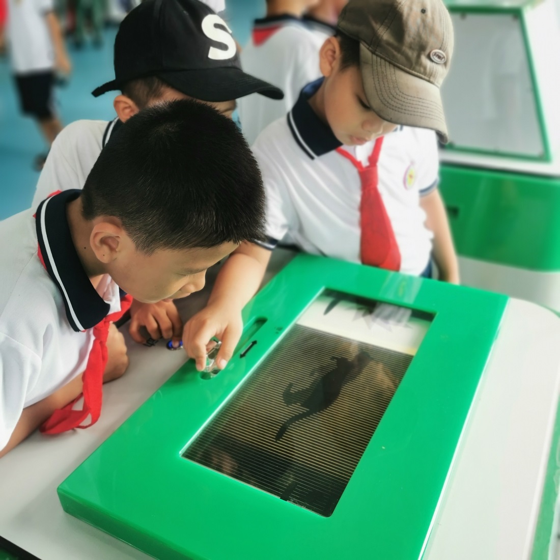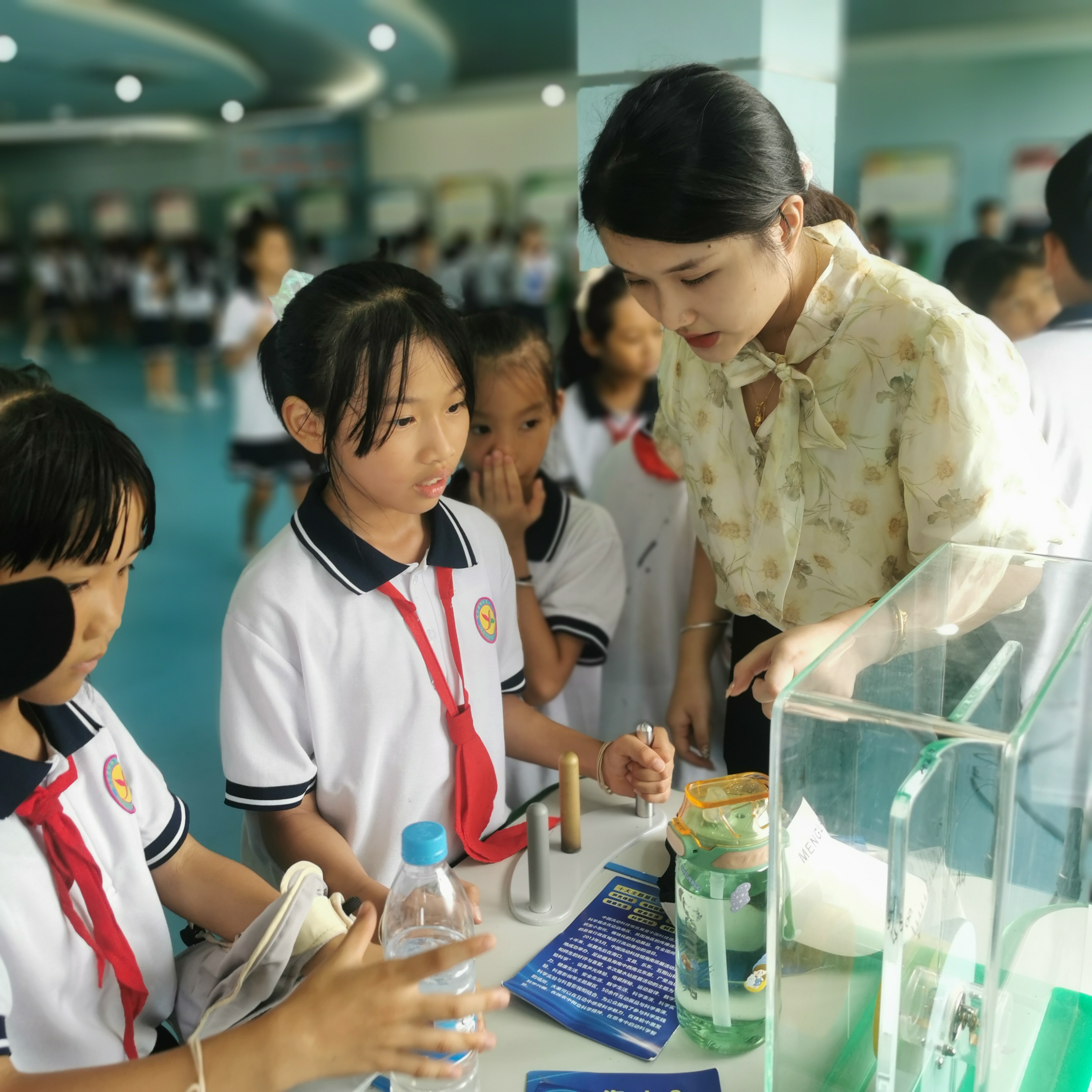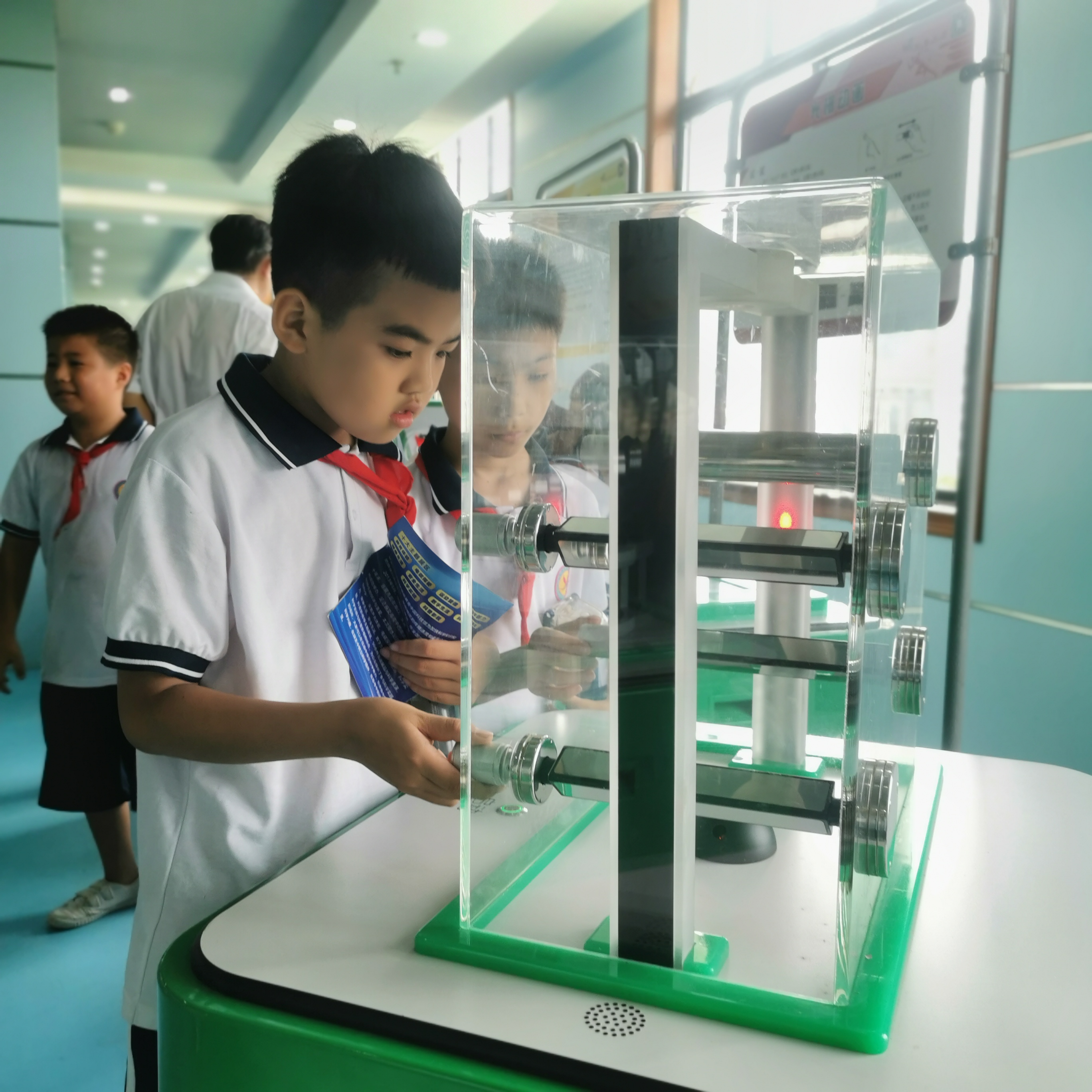 在工作人员的引导下,学校师生仔细观看,认真聆听讲解员的介绍,同时还积极参与到现场摆列的声光体验、电磁探秘、运动旋律、数学魅力、健康生活等展品体验活动中来。