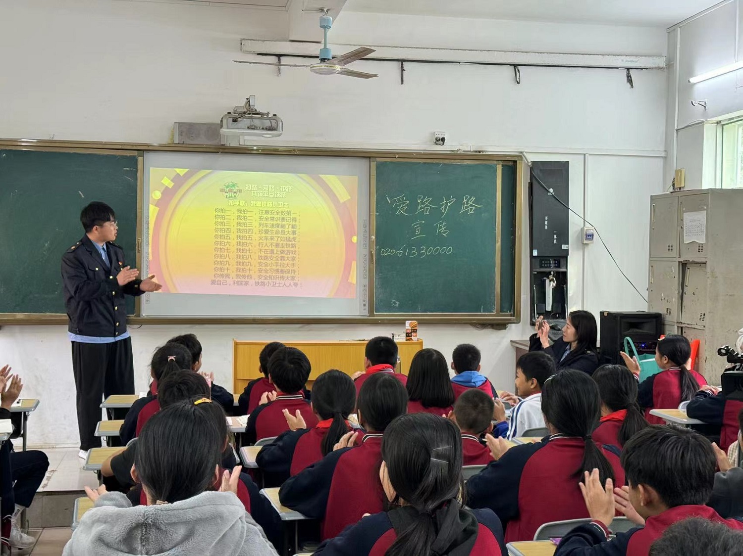 在光坡中心小学,宣传组通过《铁路安全教育》视频科普、铁路知识有奖竞答、发放宣传册等方式,教育同学们不要在铁路沿线玩耍、不跨越警戒线、不攀爬列车、不做损坏铁路设施设备等不安全行为。《铁路小卫士拍手歌》更加加深了同学们对铁路安全知识的认识,活动还引导同学们将自己所学的铁路安全知识带回家,加大宣传,做一名“爱路护路”的全能小卫士。