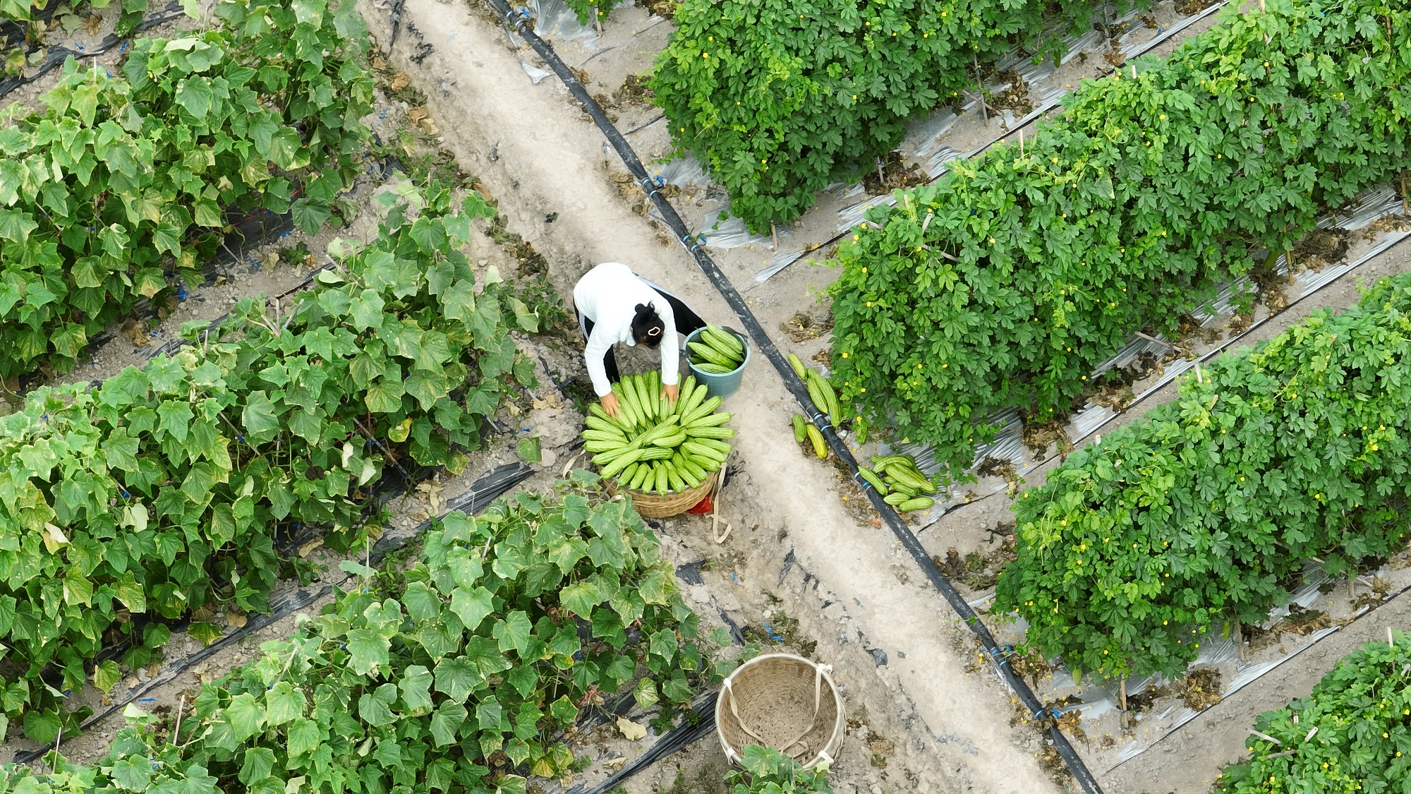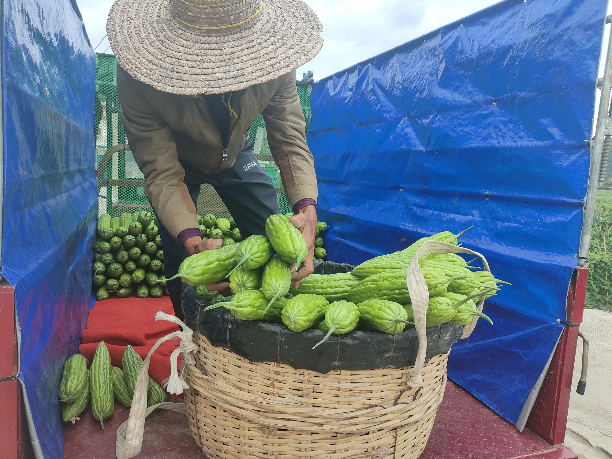 在田地间可以看到农民们忙碌的身影,一筐筐沉甸甸的苦瓜,就是他们“苦尽甘来”的最好回报。