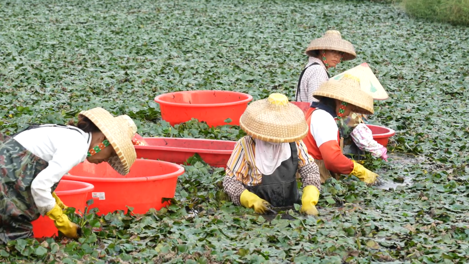在岭门居新林菱角种植地记者看到,一片片绿油油的菱角长势良好,果肉硕大饱满,种植户、采摘工人正忙碌地穿梭在田间采摘成熟的菱角。