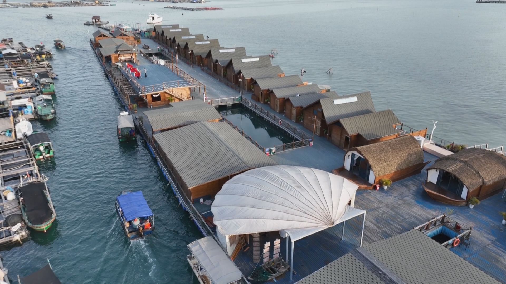 从空中俯瞰,疍家渔排绵延数里,就像一座“水上城市”。波光粼粼的海面上,木板搭起纵横交错的网箱,网箱上的铁皮木屋倒影交错,400多户渔排星罗棋布,形成一道壮观又独特的风景。伴随着“突突突”的马达声,一艘艘“海上出租船”忙碌地穿行于渔排与码头的水道间,带领游客们“沉浸式”住民宿、赏文化、品美食,体验疍家人诗意又自由的“水上人生”。