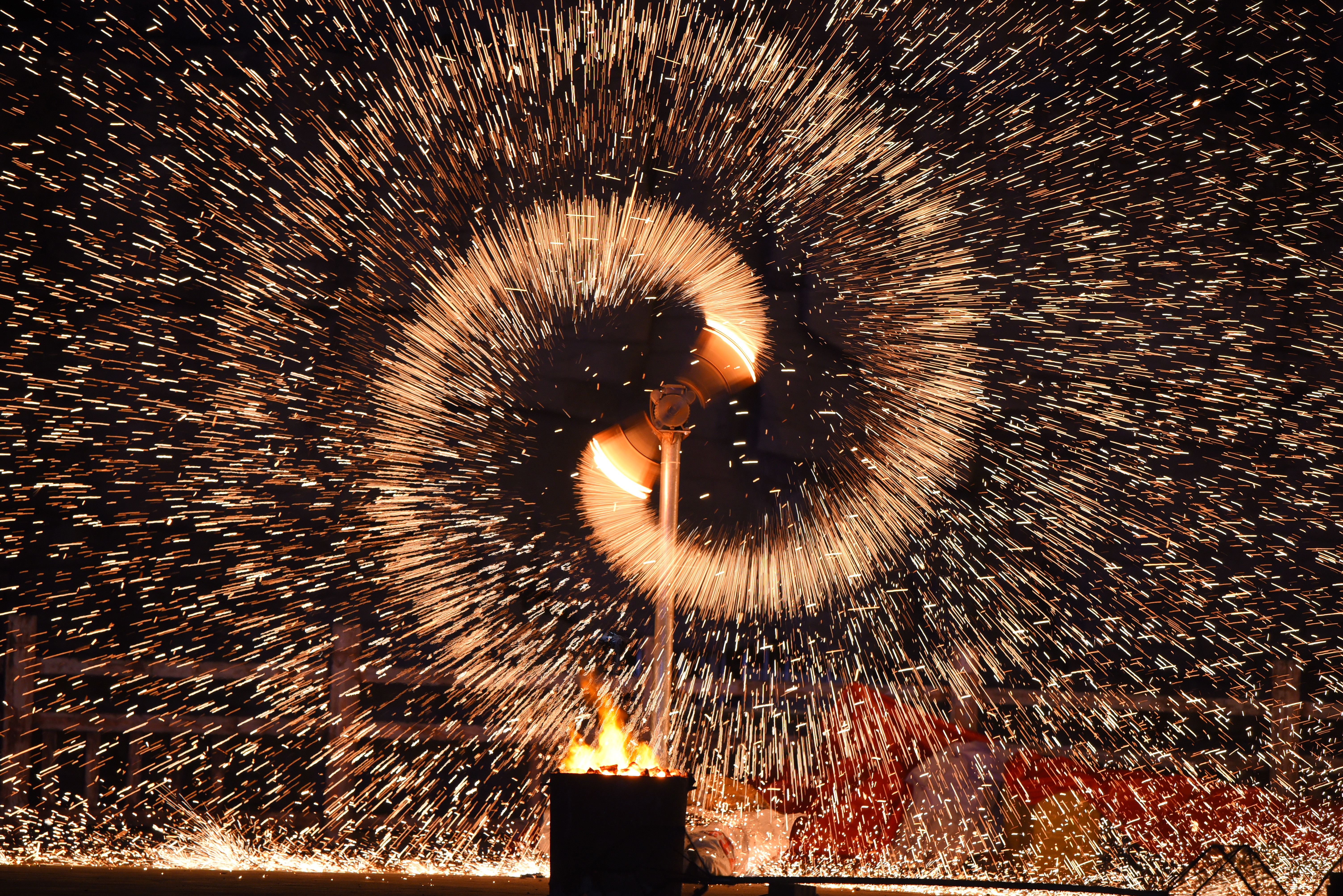 海口海纳文化传媒有限公司总经理丁大光告诉记者:“中国非遗文化打铁花有一千多年历史了,我们现在是将风火轮、火壶表演融在一起来举办这个活动。”