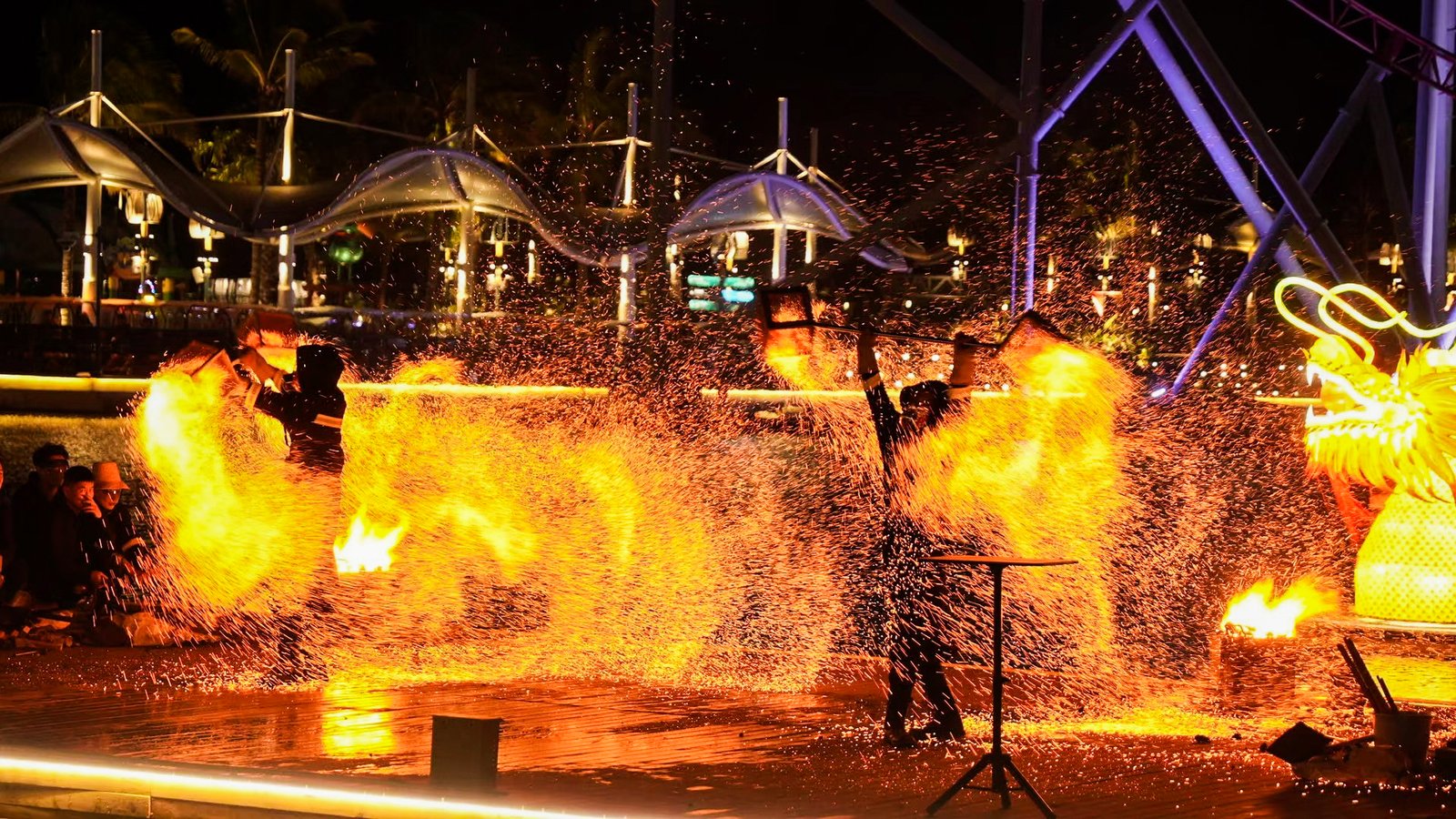 为迎接首个世界非遗版春节,海南海洋欢乐世界倾力筹备了一场场震撼心魄的表演。千年非遗打铁花、百年非遗火壶、火龙等八大火系非遗表演齐聚现场,非遗表演者凭借巧夺天工的技艺,以火为墨、以艺为笔,一抖、一敲、一洒之间,焰火似星河璀璨闪烁,源源不断地释放出新春的福泽与喜悦,让游客深切领略到传统文化的极致魅力。