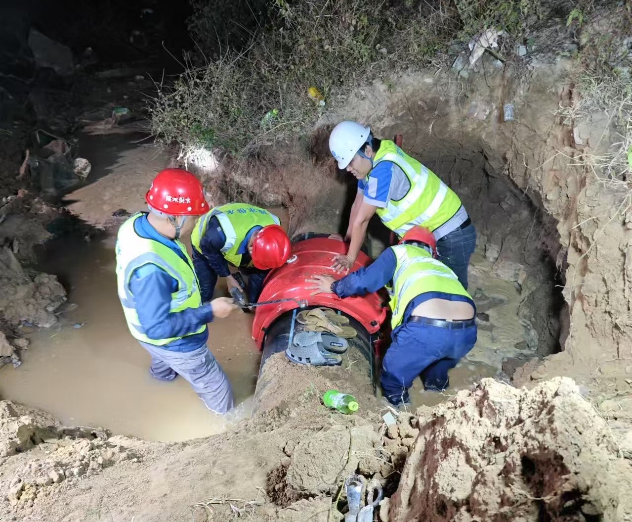 对此,陵水迅速启动应急预案,组织供水公司技术人员第一时间赶赴现场,在做好安全防护措施后,使用供水管网GIS系统对破裂管道进行分析,迅速定位漏水点位置,争分夺秒展开抢修工作。技术人员高效协作、分工有序,带压维修经过11.5小时的连续奋战完成抢修,恢复正常供水。
