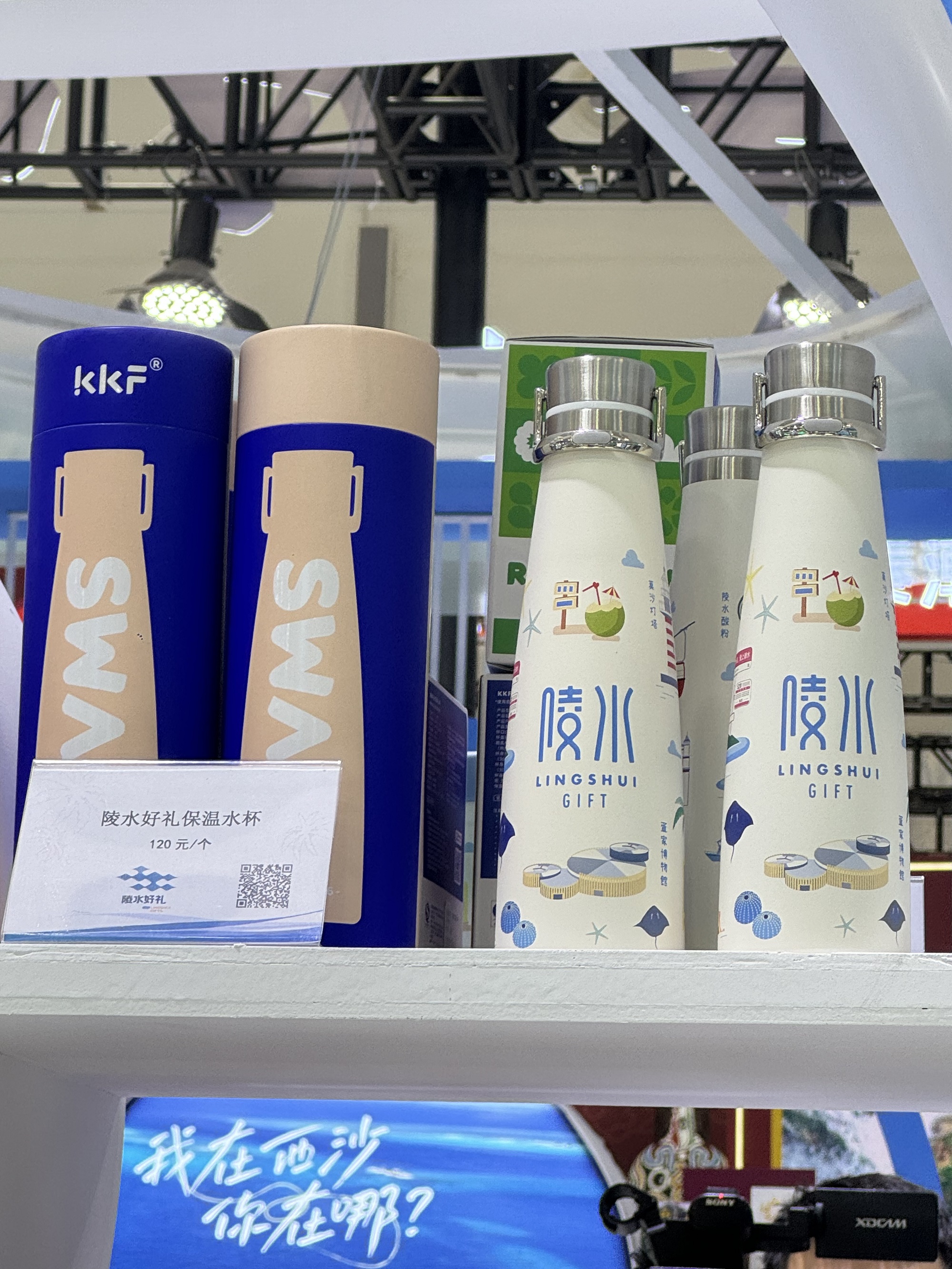 陵水文旅投资开发有限公司陵水好礼销售员涂起红介绍,“此次‘陵水好礼’带来了一系列极具特色的产品,例如以气鼓鱼为原型的气鼓鱼ip形象礼盒,里面包含了冰箱贴以及气鼓鱼玩偶,此次还带来我们‘陵水好礼’定制系列保温杯,上面印了陵水特色地标,以及海洋生物,有多种杯型选择,欢迎大家前来购买。”