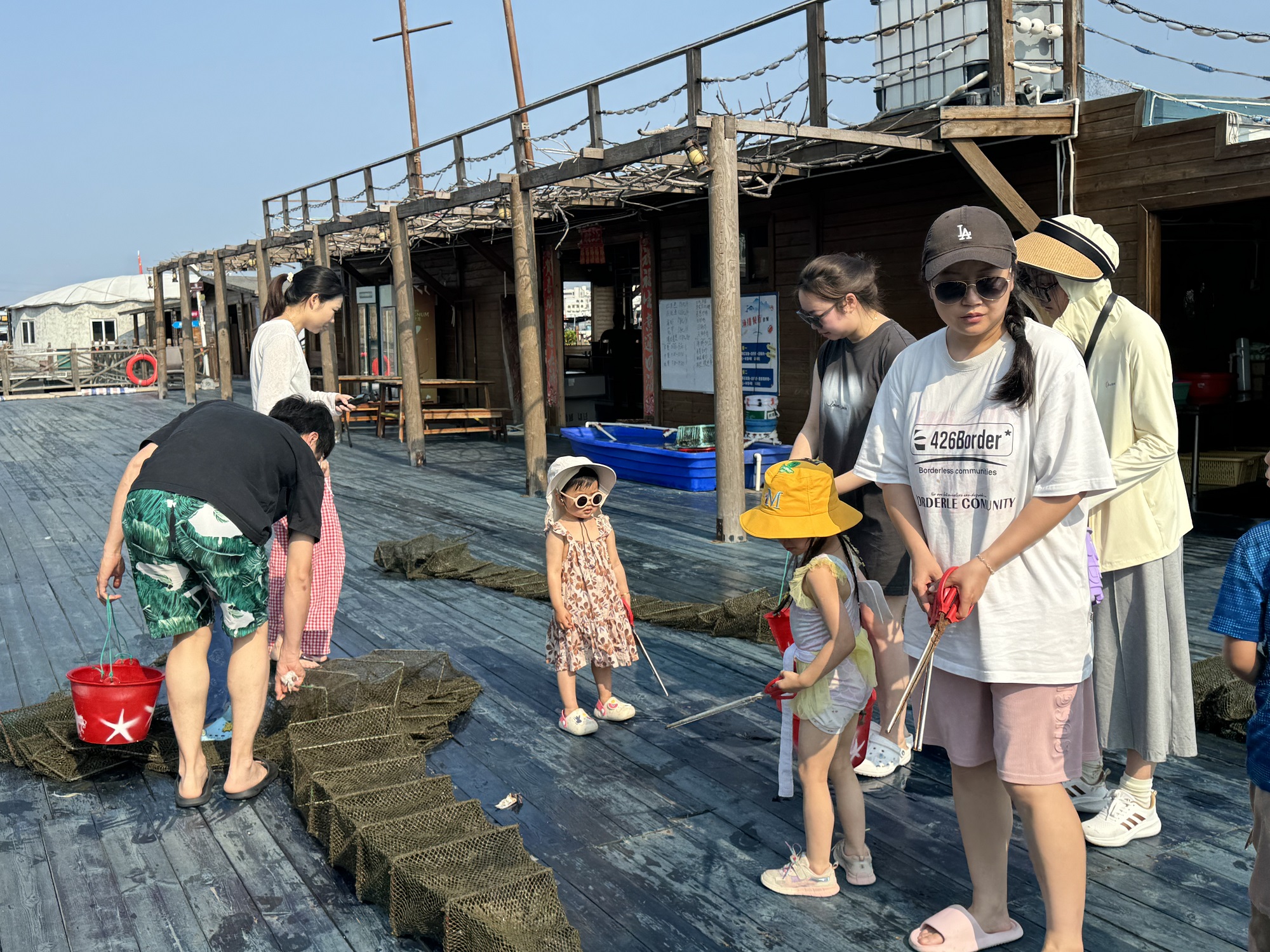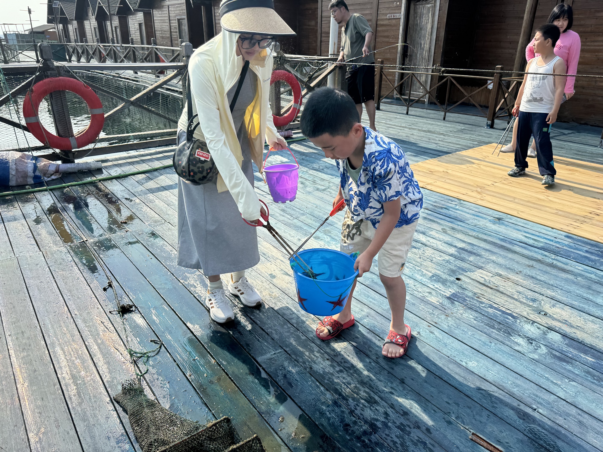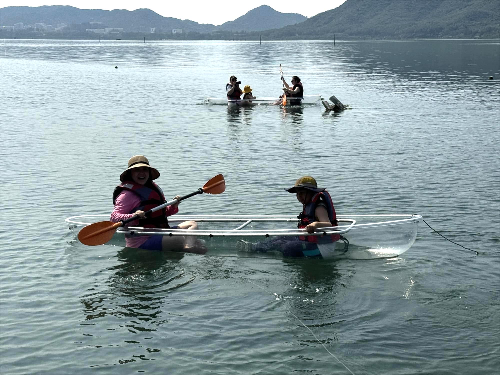4月29日,在新村疍家渔排海上民宿,记者看到众多旅客正在体验拖地笼、坐玻璃船游玩等水上特色活动。从拖地笼的笼子里拾捡小螃蟹、小虾等,大人和孩子们玩得其乐融融;坐玻璃船,亲身体验在水上划船的乐趣。