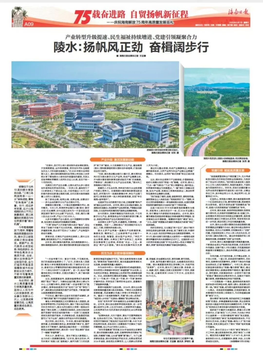 海南环岛旅游公路陵水段蜿蜒盘绕,宛如美丽画卷。海南日报全媒体记者 张茂 摄 俯瞰位于北纬18度的陵水黎族自治县,“三湾三岛两湖两泉一山一水”串珠成链,素有“珍珠海岸”之美誉。如今,经过多年发展,这片山海相拥的热土不只以美景闻名,更以其蓬勃的发展活力向世界展示着“陵水机遇”。 今年是海南解放75周年,乘着海南自贸港建设的东风,陵水正以破茧成蝶之势加速蜕变。数据产业、现代服务业成型起势,特色旅游业、热带特色高效农业提质升级,当前,陵水加快推动产业转型升级,全力打造热带海岛滨海精致城市和创新创业活力城市,不断书写着高质量发展的新篇章。 与此同时,陵水以高质量党建引领高质量发展,坚持以人民为中心的发展思想,把实事办到群众心坎上,让发展成果普惠百姓,让高质量发展成色更足、底色更亮。 “在陵水,我们可以将小游戏制作成本降到更低,开发周期更短,运作效率更高,项目创作团队也能更加关注人才的创新创造能力。”在2025年陵水全球招商大会上,陵水鸿知源网络科技有限公司创始人沈李明分享了落地陵水小游戏创作者基地的感受,而其从实地考察到带着家人和团队在这儿扎根,前后不到一个月的时间。 充满活力的产业生态圈,让陵水成为众多小游戏创作者奔赴的首选目的地。一年多以来,基地吸引了102家游戏上下游企业入驻,已经有超过116万人次的海外游戏玩家通过海底光缆,访问在陵水服务器部署上云的212款游戏。 除了游戏出海,短剧出海、品牌出海、创意设计……多元业态的数字文化产业在陵水开花。 俯瞰陵水黎安镇,一片海边别墅群鳞次栉比、格外醒目。今年2月,欧美同学会海归小镇(陵水·数字文创)在此揭牌,如今这里正成长为一片宜创宜业宜居宜游的“数字文化出海”产业社区。目前,海归小镇入驻企业224家,产业人口近2000人。 从多年闲置到产业化盘活,这片别墅群的华丽转身,恰似陵水县域经济发展蝶变的缩影。 “三湾”房地产大开发曾为陵水成功“输血”,但也带来了发展不平衡不充分的困局。想要推动县域经济健康发展,就必须下定决心“大换血”,产业转型升级迫在眉睫。 思谋求变,在调优产业结构这条路上,陵水立足禀赋,锚定新质生产力,开创新局面。 近年来,陵水聚焦向数图强,依托海底数据中心、国际海缆登陆岸站、陵水黎安国际教育创新试验区经济“新三样”建设,大力发展数字文化产业,建设海南(陵水)国际数据港和陵水国际创作者港湾,打造创新创业活力城市。 “当前,陵水推动整合海归小镇片区、清水湾科技园片区为陵水数字文化产业园,形成产业集聚主体,并与陵水黎安国际教育创新试验区开展‘区县融通、产教联动’,推动数字文化产业生态发展。”陵水科工信局局长方乾宇说。 俯瞰陵水黎安国际教育创新试验区。海南日报全媒体记者 封烁 摄 显著的人才生态优势,同样成为吸引企业投资落户的核心竞争力。在海南陵水黎安国际教育创新试验区,多所国内外一流高校聚集办学,学生不出国门就可以享受到世界一流大学的教育资源,实现“学在海南=留学国外”。 这座拔节生长的教育开放之城,正链接着“教科产城”融合业态的未来。近年来,陵水立足试验区建设,加速推动区县融合,形成教育产业纵深拓展、产教融合创新实践、文化经济协同发展的现代服务业发展新格局。 如今的陵水,发展环境愈加开放和包容,不仅有数字文化产业、教育服务业作为发展的新质引擎,农业、旅游业等传统产业也在焕发新的生机。 走进陵水文罗产业园,机器轰鸣,车辆穿梭,一派忙碌景象。目前一、二期标准化厂房及商配开足马力施工,三期、四期同样招商火热。 陵水文罗产业园是一座集农产品跨境贸易、集散批发、精深加工、工业旅游等产业功能于一体的生态型、智慧型、综合型产业园区。“园区产业从啤酒、酸粉、水果加工等产品深加工,延伸至航技维修等工业领域,串联起‘农业-工业-旅游业’跨产业价值链。”陵水县农投集团相关负责人何为介绍。 通过优化整合资源,形成产业集聚效应,构建完善的服务体系,文罗产业园为农业产业链企业搭建广阔舞台。而在陵水,这样的“链式发展”效应正逐步显现。 过去,陵水农业受限于产业链条短、价值链条短、组织化规模化低的“两短一低”难题。近年来,陵水以“三点一融”为路径(“三点”即以南繁种业、海洋渔业、热带高效种植业为发展重点,“一融”指农工旅融合发展,延长产业链,发展加工贸易和旅游业),推动热带特色高效农业集群化发展。 “我们体验了海钓、赶海、游船等项目,都特别有趣,疍家美食也让人流连忘返!”刚刚结束的“五一”假期,来自北京的游客顾清云一家选择到陵水旅游,这里的美景和独特的疍家渔排文化给他们留下了深刻印象。 这座占地6000平方米的疍家渔排集餐饮与海钓、桨板等水上娱乐活动于一体,自2024年运营以来,吸引着省内外游客前来体验游玩。近年来,陵水着手清除违规渔排和清退近岸海域禁养区养殖场,促进海域生态环境修复。随着新村港的“蝶变”新生,“文化+旅游”深度融合的疍家风情游成为新晋“网红”旅游线路。 用好自然珍宝、文化瑰宝“两个宝贝”,陵水不断开发特色旅游业新场景、新体验,除了疍家文旅,科普研学、水上运动、低空经济等新业态也颇受游客青睐。今年3月,陵水