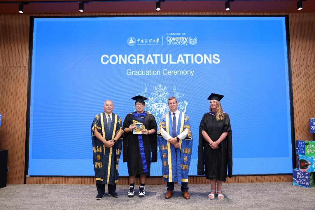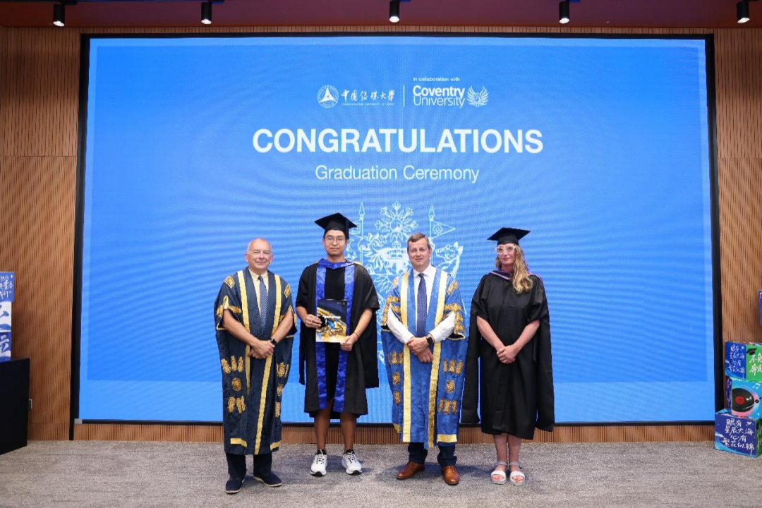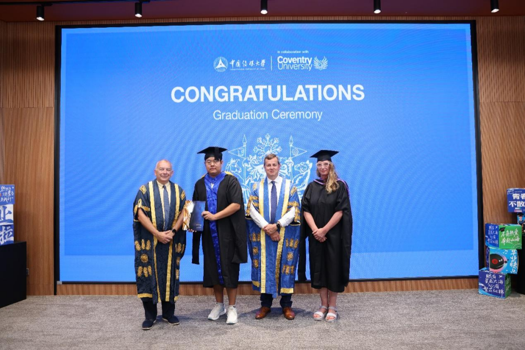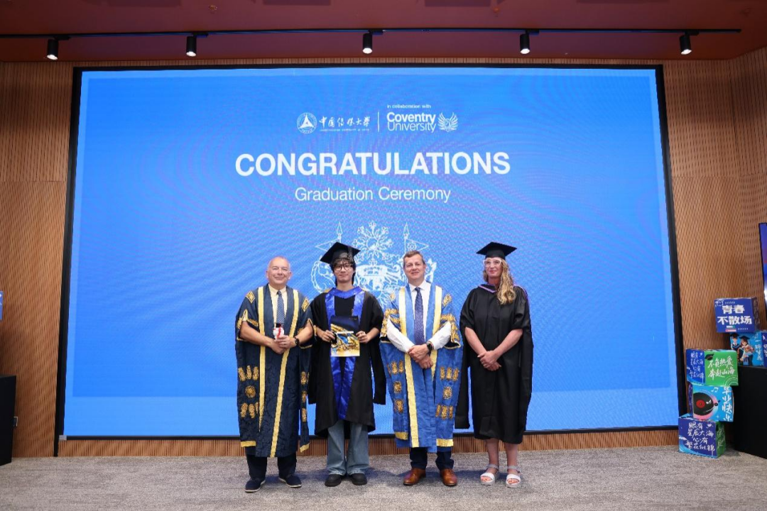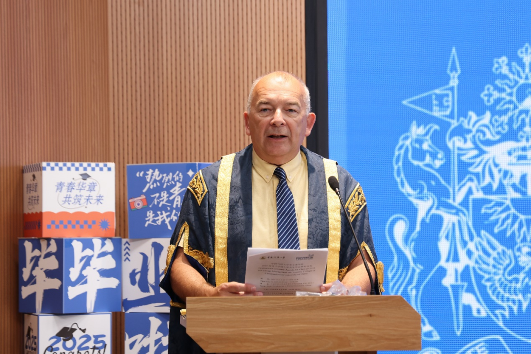 约翰·拉瑟姆在致辞中向毕业生表示热烈祝贺,并向试验区管理局为两校合作提供的重要支持表示感谢。他表示,双方的合作不仅探索出国际化复合型人才的培养之路,也搭建起中英人文交流的重要桥梁。他以考文垂大学校徽中象征重生的凤凰与象征力量的熊寄语毕业生,希望他们勇担使命,在全球舞台上展现两校合作育人的卓越成果。