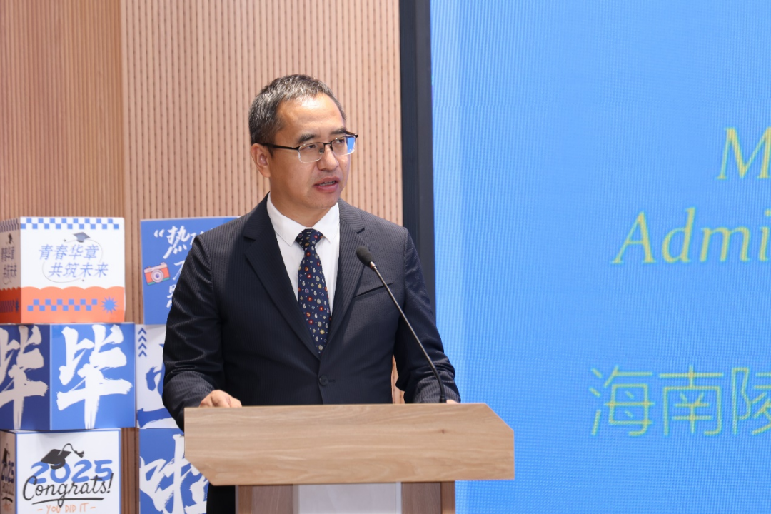 邹文涛在致辞中向首届毕业生致以热烈祝贺和诚挚感谢。他表示,两年间同学们见证了园区从蓝图走向现实的过程,作为海南自贸港首批国际化人才,希望大家以所学为力,秉持创新精神,勇敢追梦。欢迎常回母校,常回试验区,共见成长,共话未来。