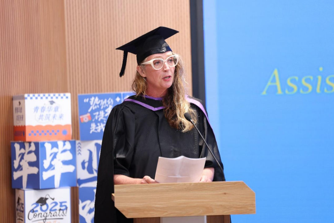 凯瑟琳·阿比克作为教师代表发言。她表示,设计管理课程融合设计思维、用户导向方法与商业管理理念,培养了学生跨学科整合能力与全球视野。她高度评价毕业生在重重挑战中展现出的专业素养与坚韧精神,并感谢两校教师的共同付出,祝愿毕业生勇敢前行、绽放光芒。