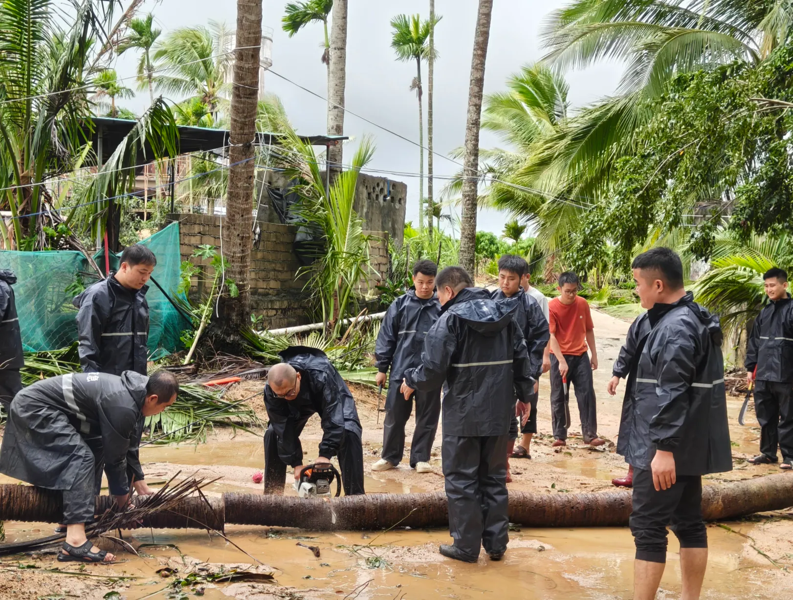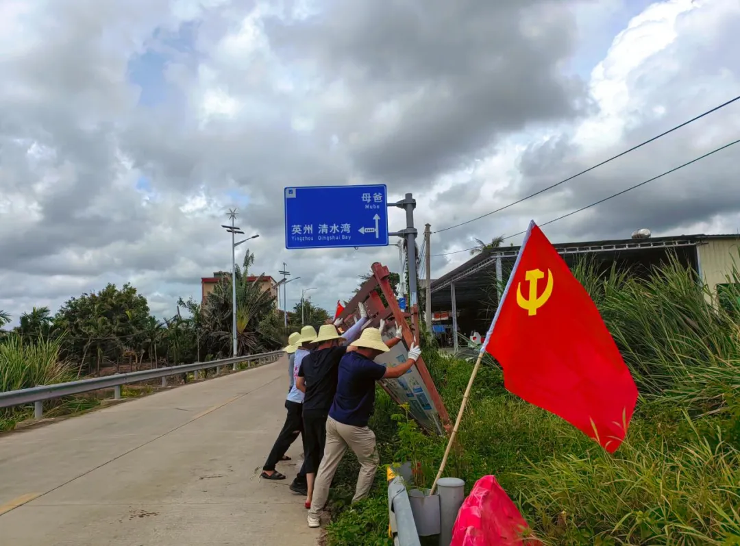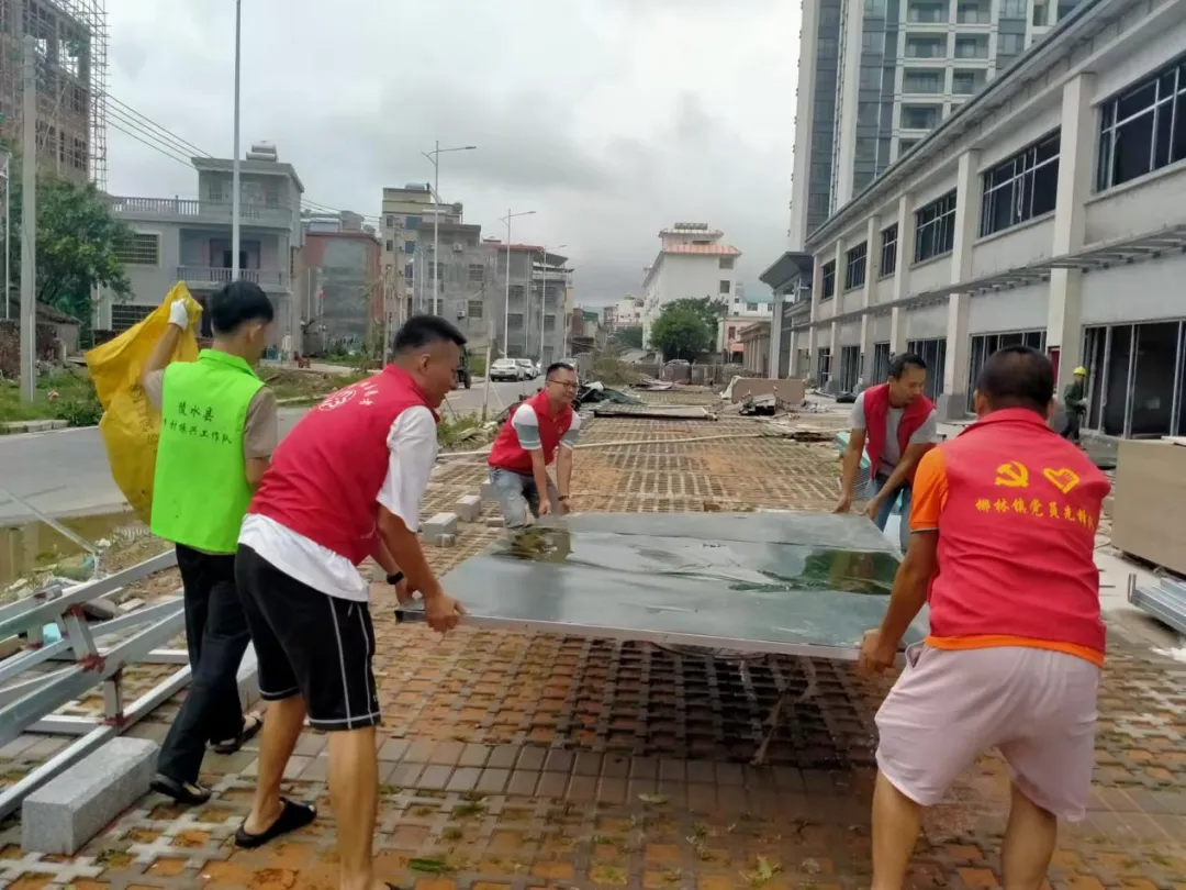椰林镇成立党员突击队,清理吹倒的施工围挡。