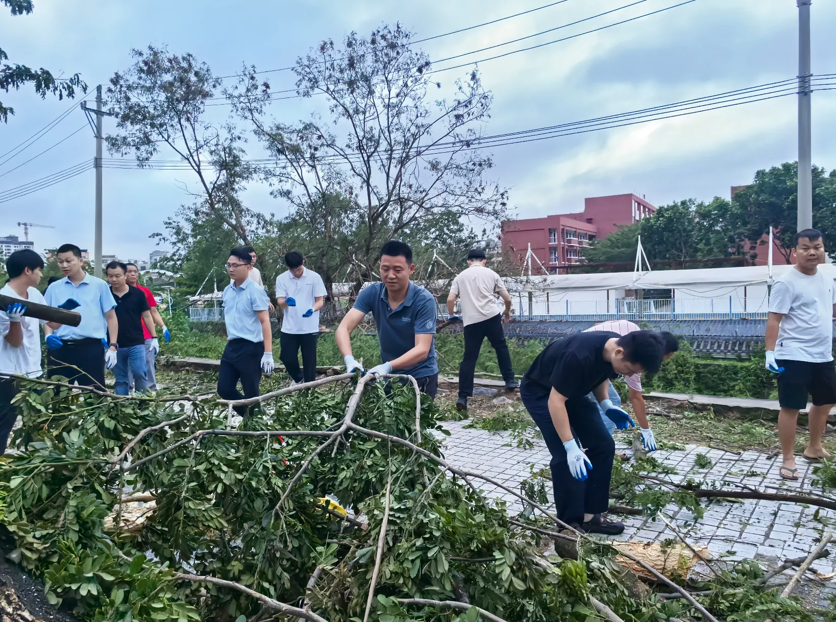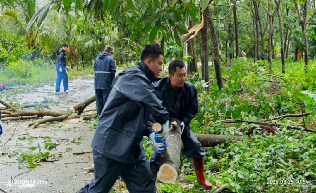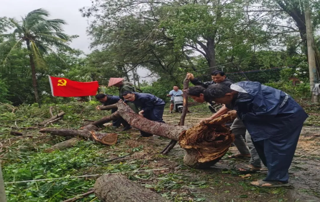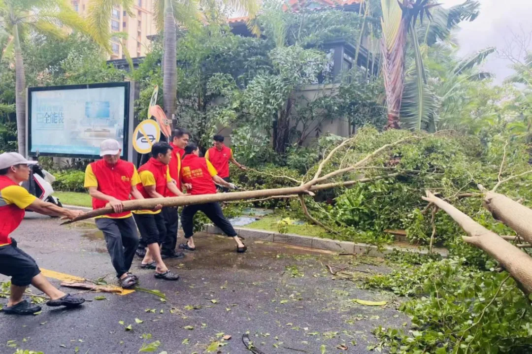 陵水县碧桂园物业党支部组织党员到街道搬运倒塌树木,疏通路面。
