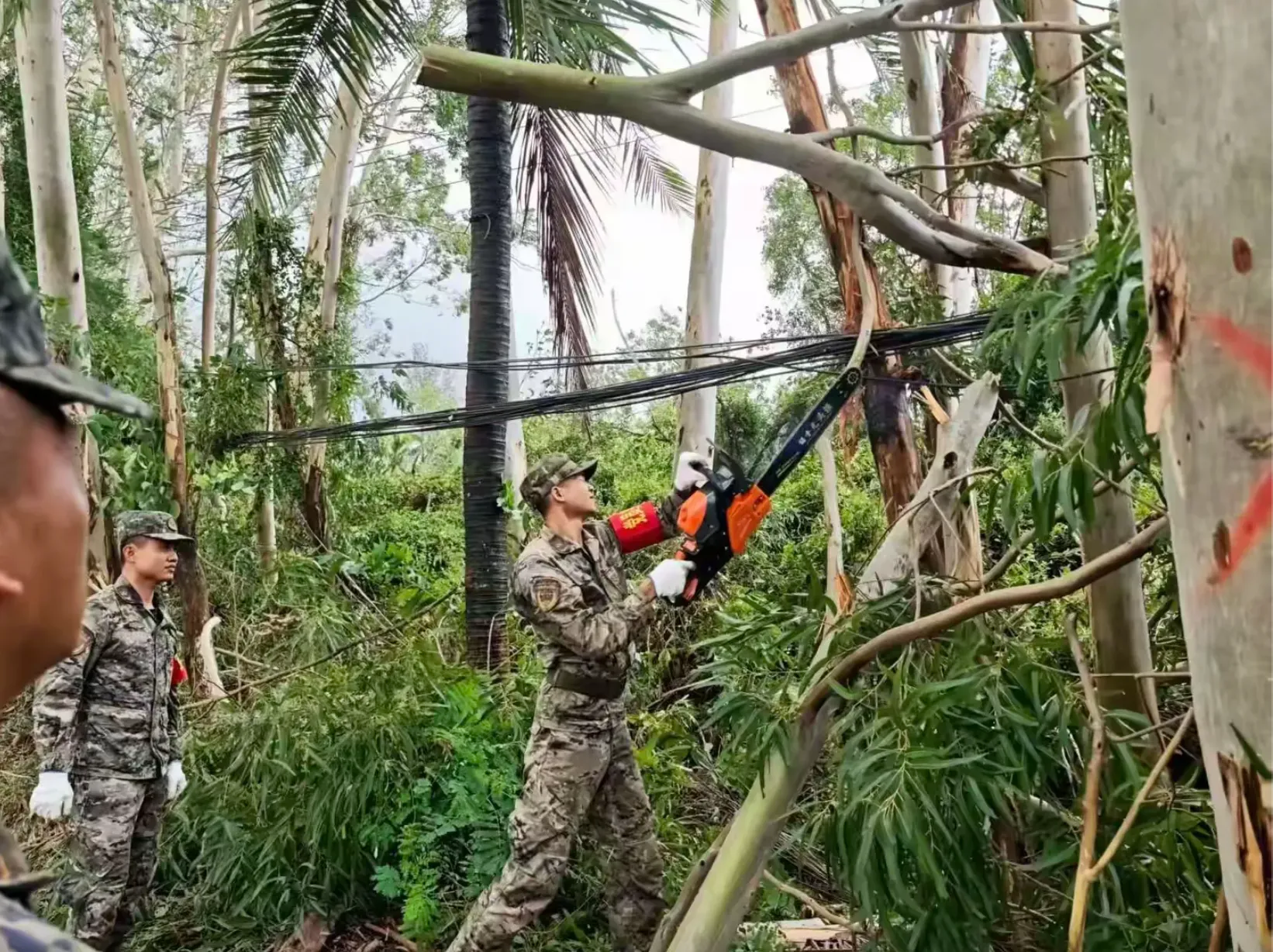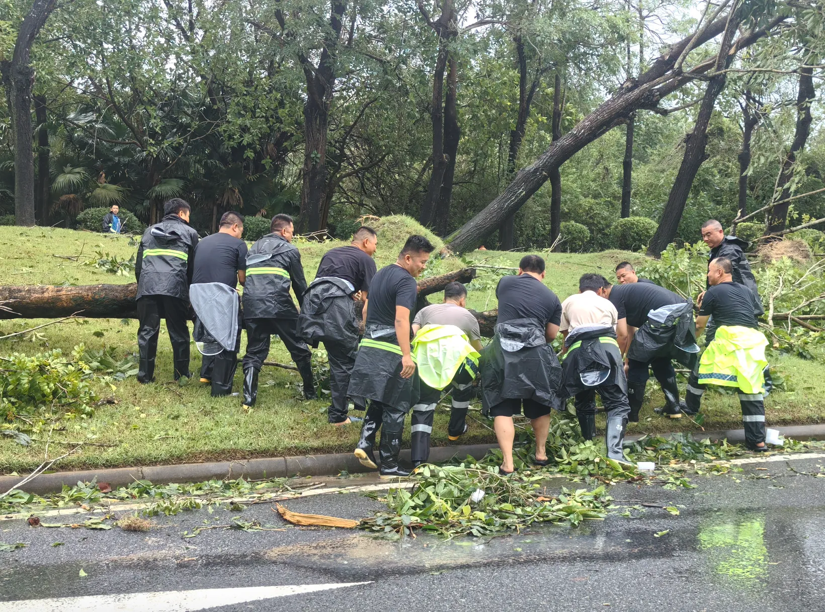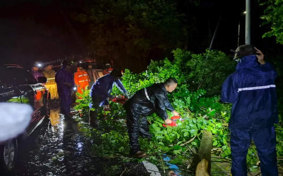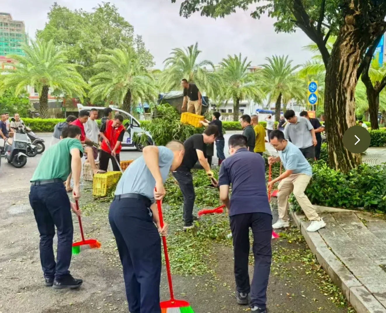 陵水县碧桂园物业党支部组织党员到街道搬运倒塌树木,疏通路面。