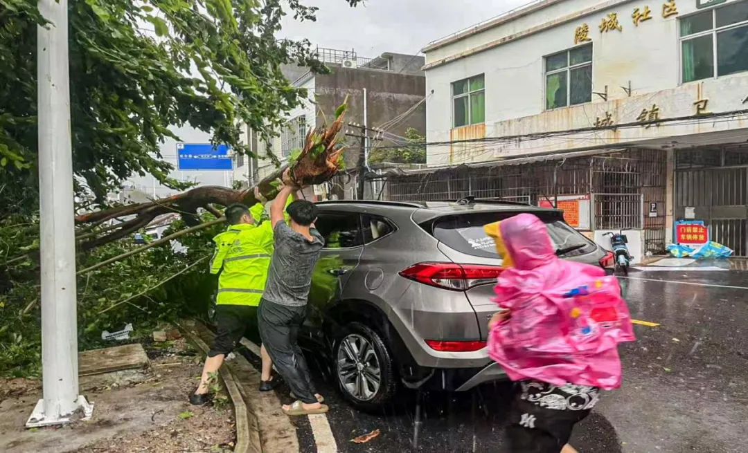 县公安局陵城派出所民辅警搬走倒在群众车上的树木。