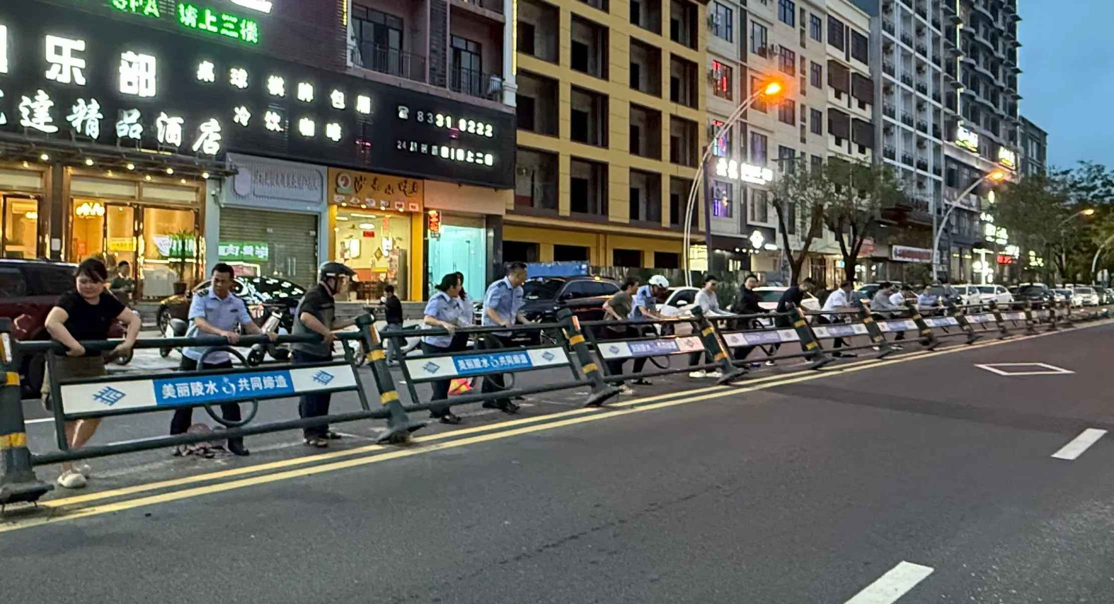 县农业农村局与县市监局党员干部携手行动,合力将倒伏的护栏扶起归位。