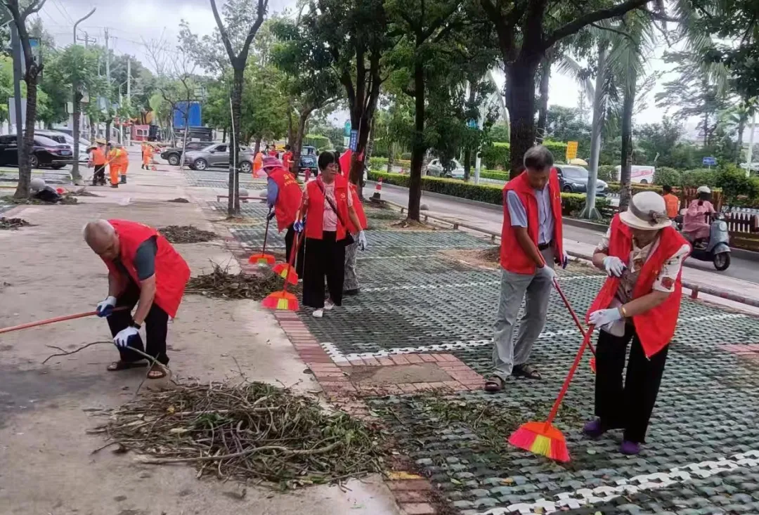 椰林镇退休干部党支部党员清扫路面。