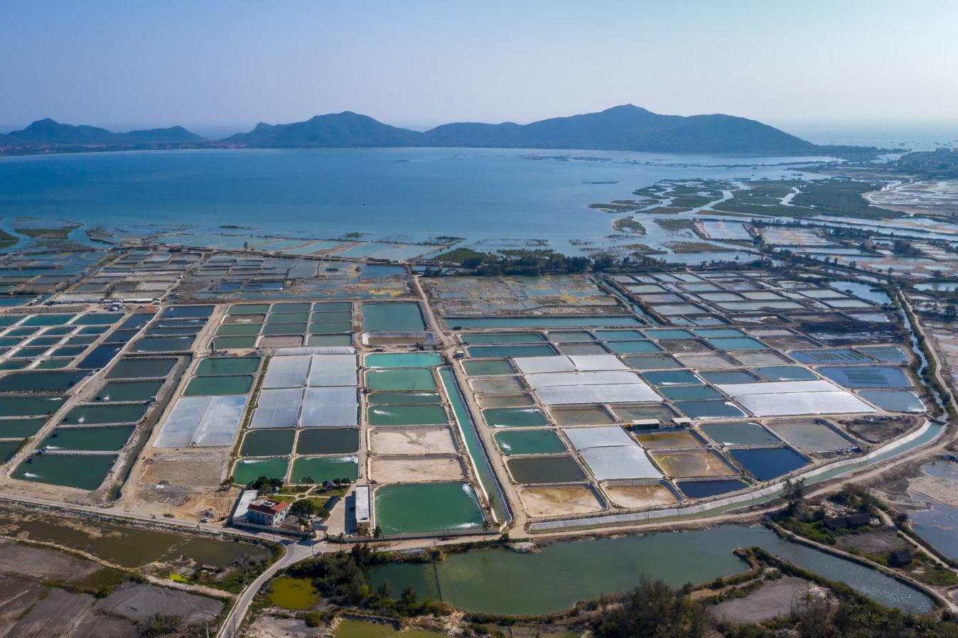 (水产养殖基地井然铺开,规整的养殖池如大地的棋盘,盛满希望之水)