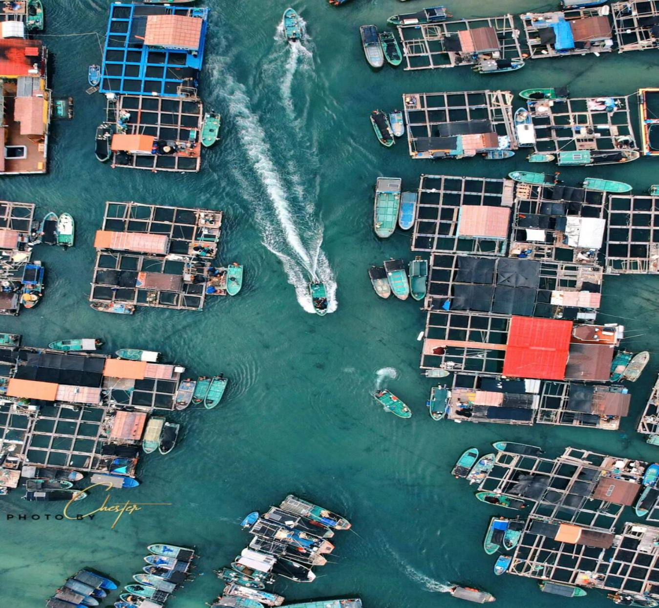 (新村港内疍家渔排如海上村落,错落有致地铺展,五彩斑斓的渔排与渔船相依相伴)