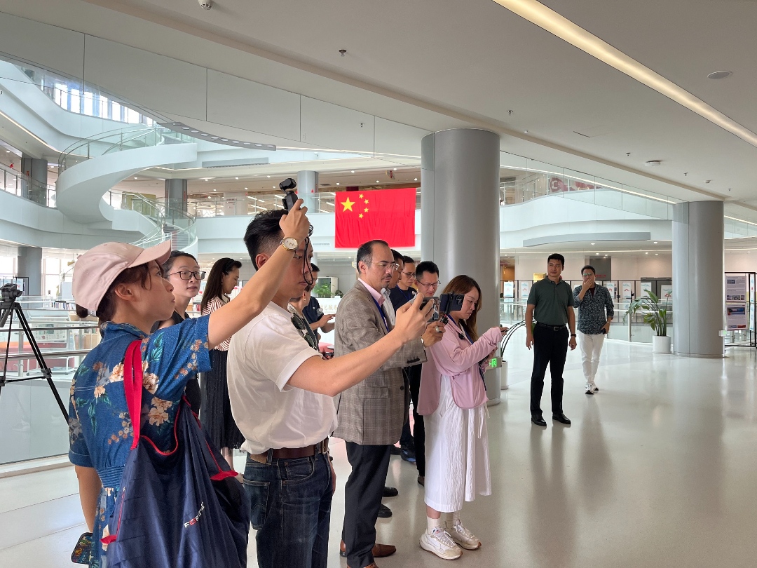 在图书馆、中国传媒大学海南国际学院楼的大模型实践体验中心、摄影摄像综合实验室等现场,采访团就智慧图书馆系统、教学应用等内容与相关负责人深入交流,并记录各类教学场所的设施配置、教学模式创新以及学生的实践作品,对试验区现代化、智能化的教育生态表示高度赞赏。