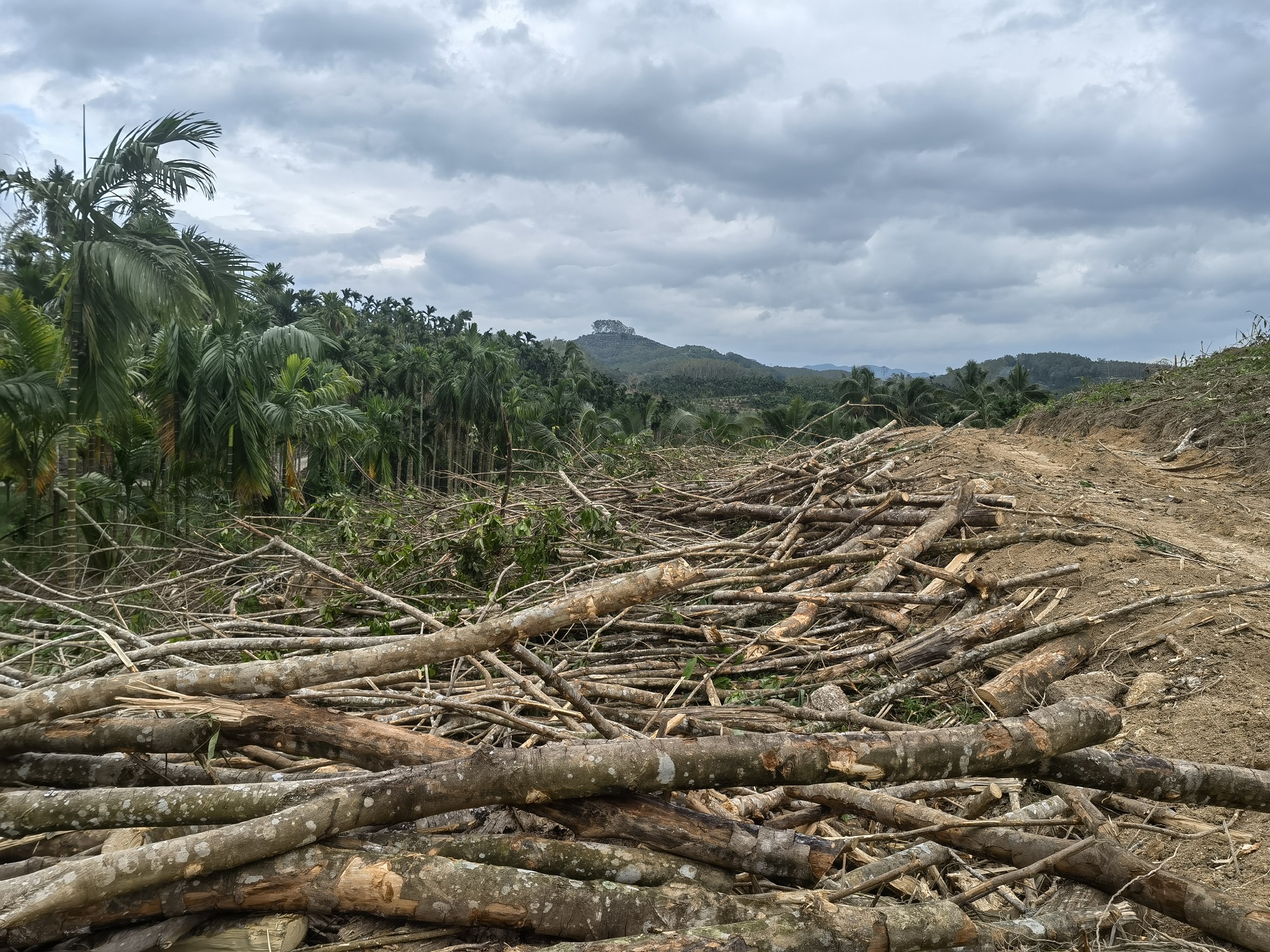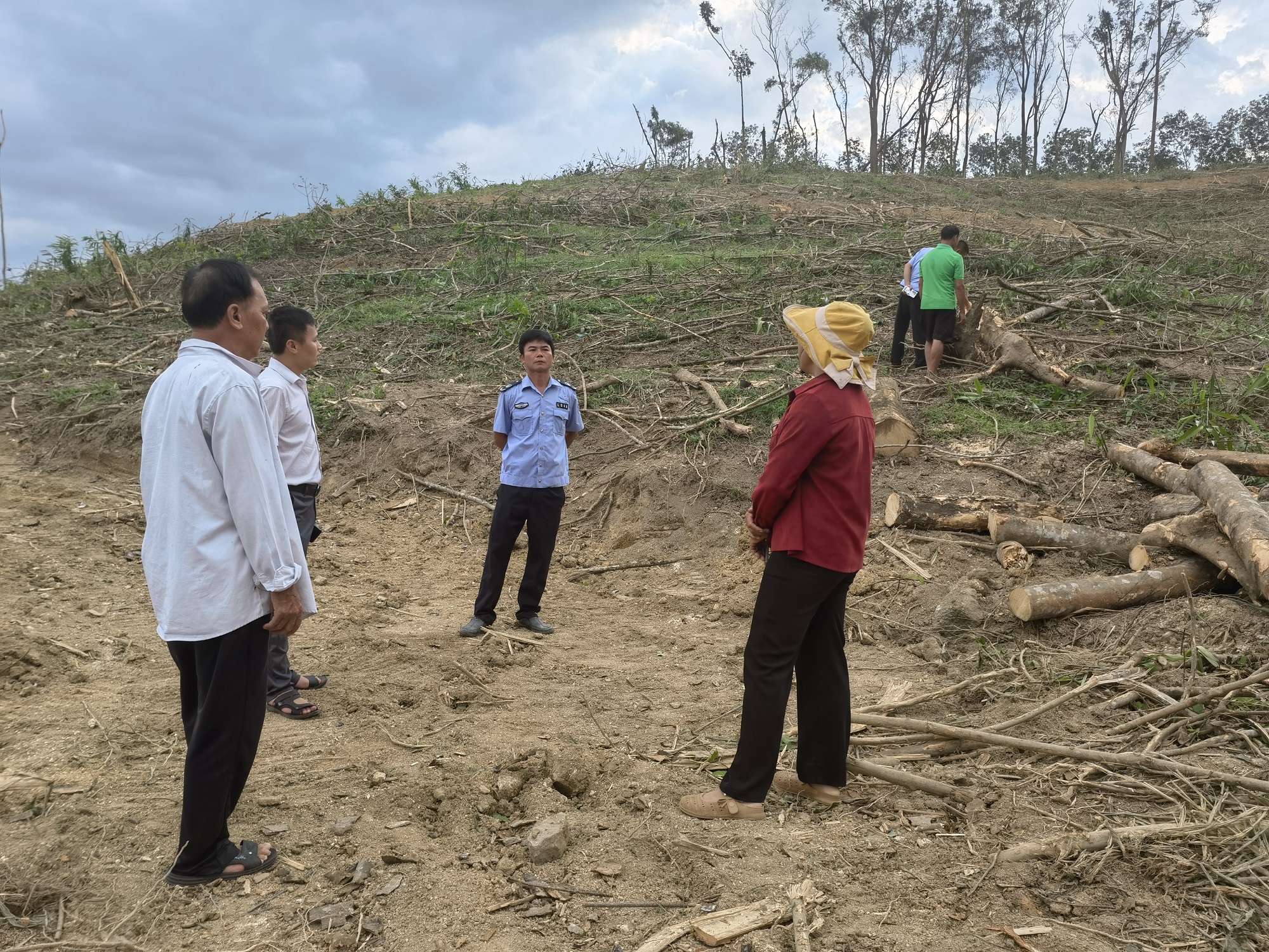 在群英乡祖空村坡地上,记者看到,此前被狂风刮倒的橡胶树、槟榔树已清理完毕,等待清运。