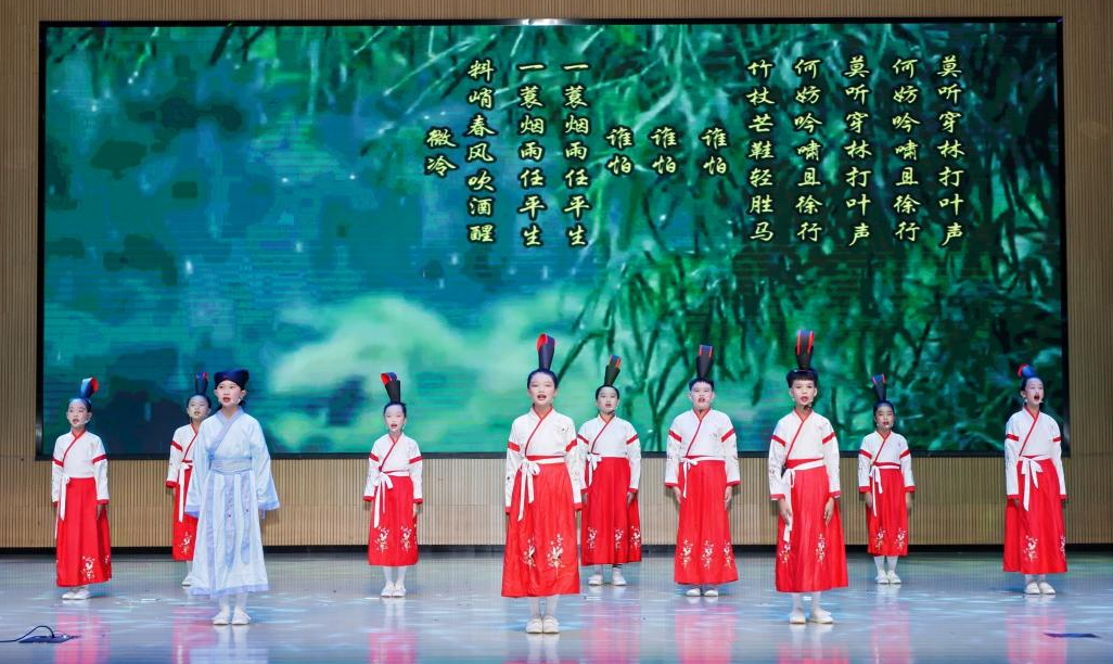 小学组的比赛首先拉开序幕。孩子们用稚嫩清澈的嗓音,配以活泼生动的肢体语言,为古典诗词注入了全新的生命力。他们手中挥舞的道具、脸上洋溢的笑容,与琅琅诵读声相得益彰,在舞台上绘就了一幅幅传承中华文脉的生动画卷。