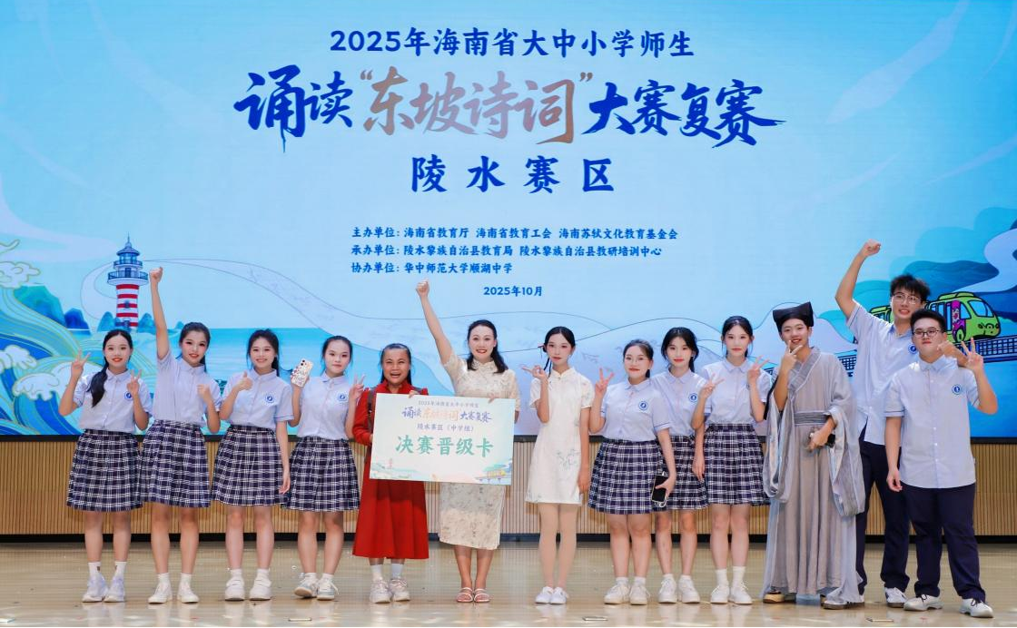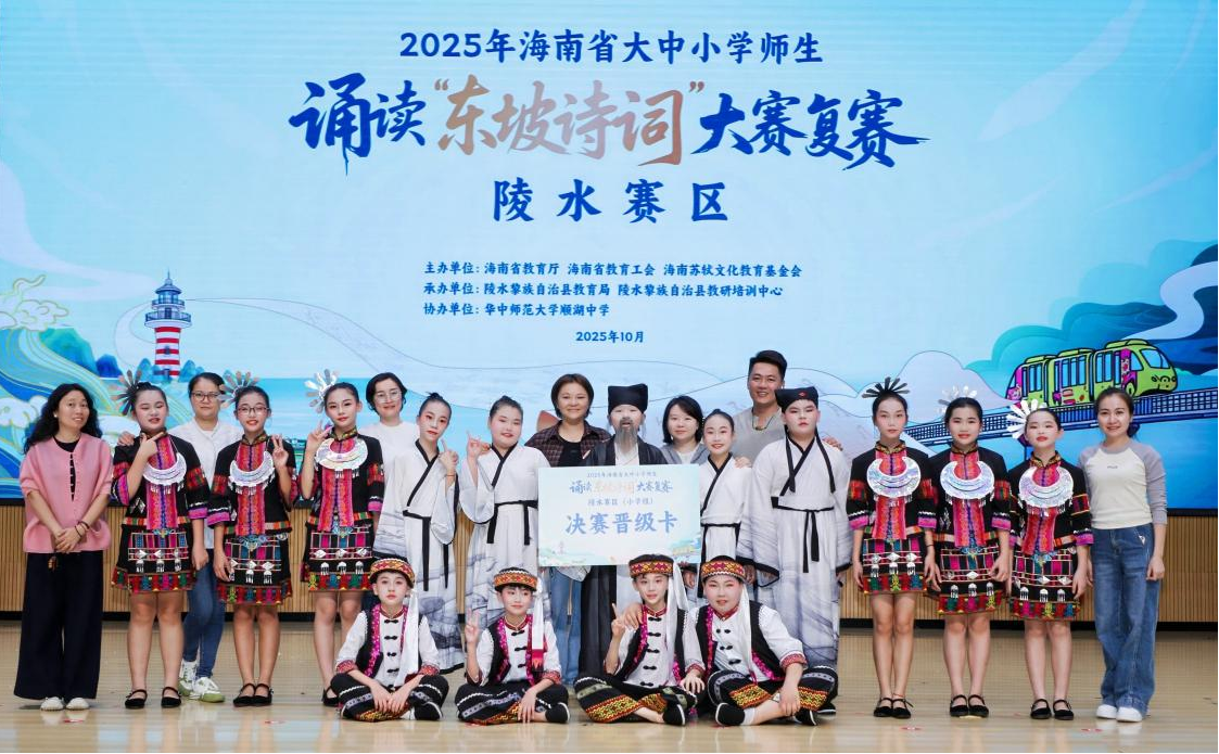 10月25日,由海南省教育厅、海南省教育工会、海南苏轼文化教育基金会联合主办,陵水黎族自治县教育局、县教研培训中心共同协办的2025年海南省大中小学师生诵读“东坡诗词”大赛复赛(陵水赛区)在华中师范大学顺湖中学成功举行。来自各地的12支中小学参赛队伍齐聚陵水,在诵读中体悟东坡文化的深厚底蕴,在竞技中展现新时代青少年的文化自信。