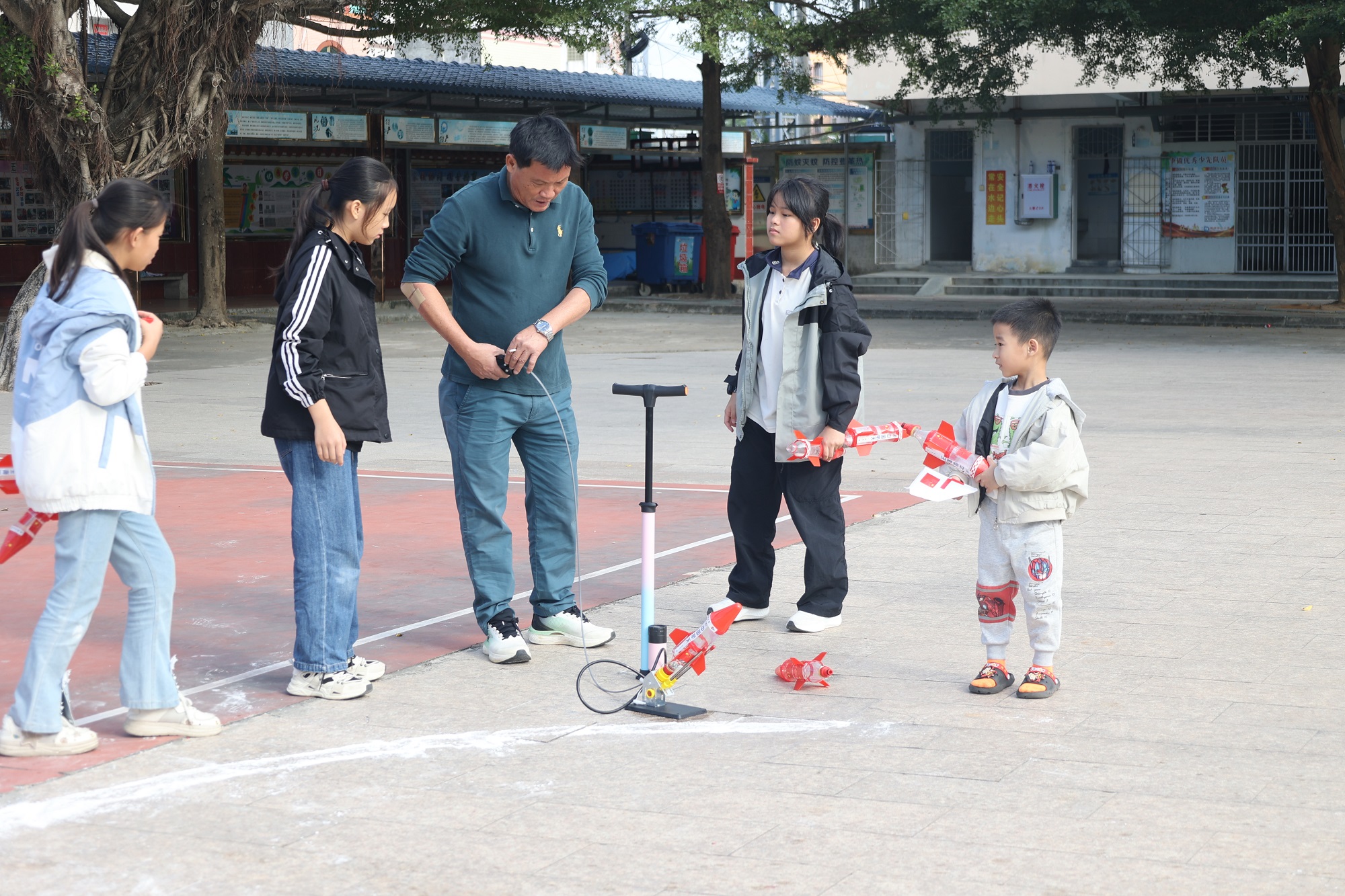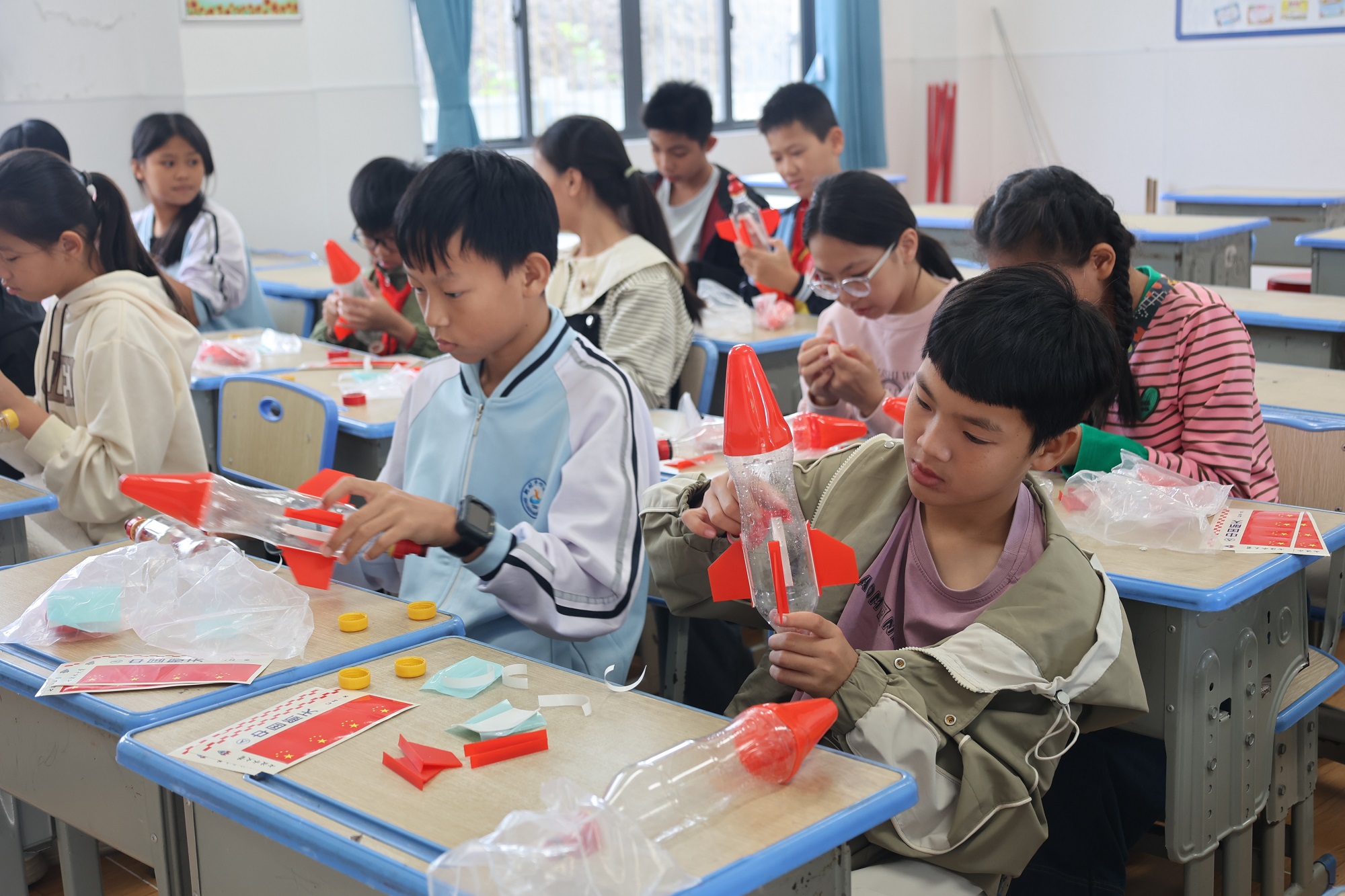 水火箭实践环节更是精彩纷呈,同学们以饮料瓶为基础材料,自备工具现场完成箭体组装、配重调试与尾翼制作,严格遵循“3个以上尾翼”“配重内置”等科学要求,在60分钟内攻克模型搭建的各个难关。发射环节中,随着加压完成的指令,自制水火箭依次升空,划破天际的轨迹引来阵阵惊叹。同学们在测量落点与靶心距离的过程中,学习力学平衡、气压应用等知识,深刻体会航天发射背后的科学逻辑。