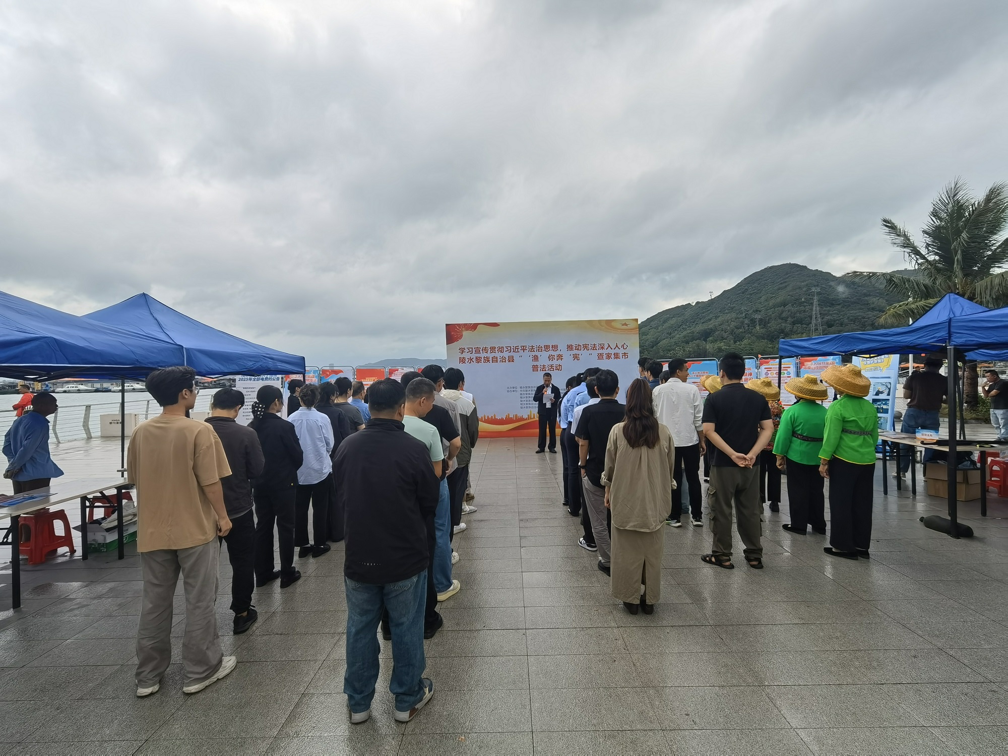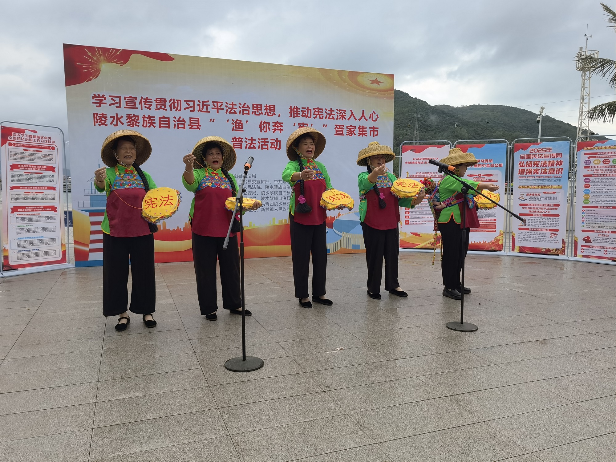 活动现场,身着传统疍家服饰的歌唱爱好者率先登台。她们以疍家经典曲调为蓝本,深情演绎改编后的法治短曲《疍歌唱响法治谣》。这种将非遗文化与普法宣传相融合的创新形式极具感染力,吸引市民游客驻足聆听、互动跟唱。