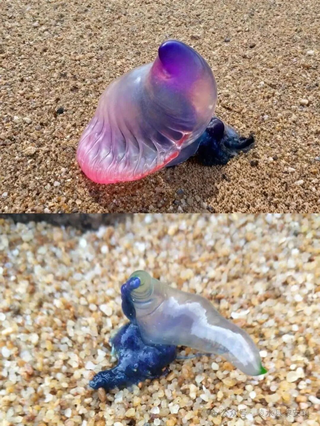 近期,黎安镇附近海域出现僧帽水母。僧帽水母是腔肠动物的一种,属于水螅虫纲,呈蓝青色,浮囊两头尖,底平,形如僧侣的帽子,因而名叫“僧帽水母”。僧帽水母的触手是由许多小刺细胞组成的,每个刺细胞中含有毒液。当触手接触人体时,刺细胞会释放毒液,被刺后会引起剧烈的疼痛、灼烧感、红肿、瘙痒等症状,严重者可导致呼吸困难、休克甚至死亡。为了确保您和家人的人身安全,特温馨提示如下:
