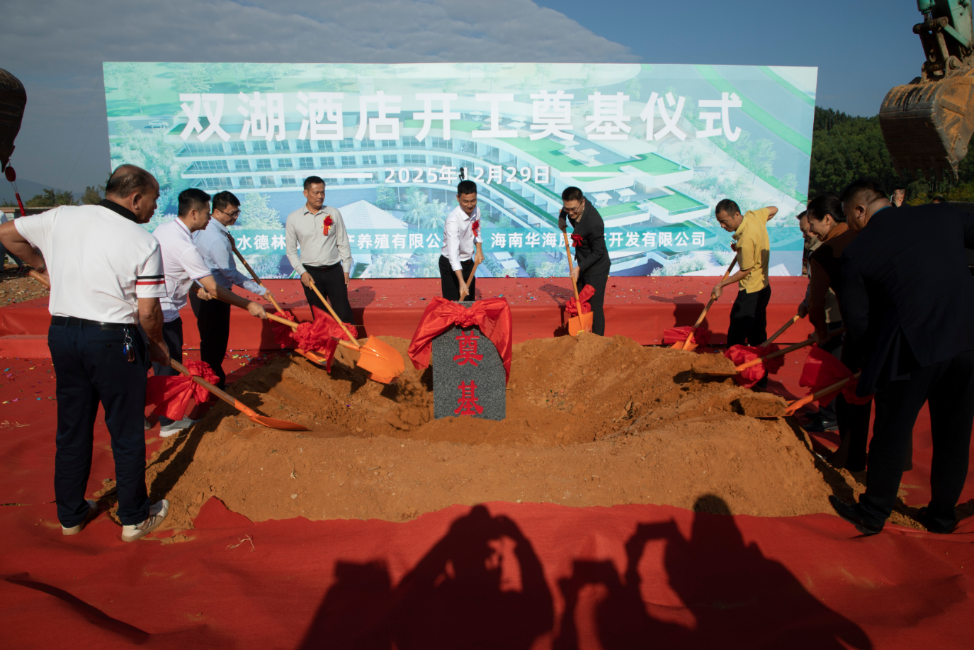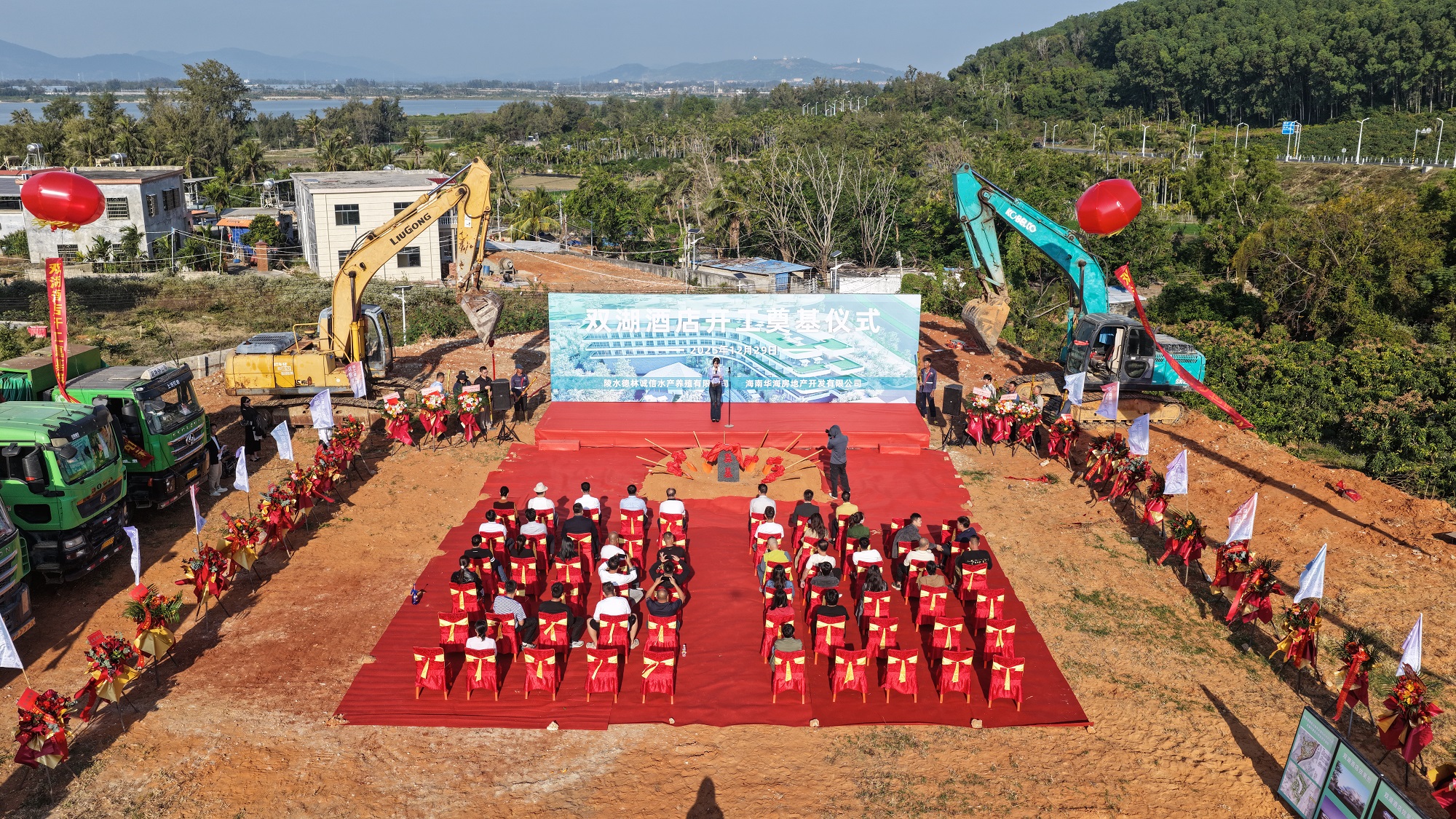 在开工仪式上,相关企业与村委会代表共同挥锹培土。双湖酒店选址位于海南环岛旅游公路大道与双湖大道交汇处南侧,毗邻海南海洋欢乐世界与陵水德林诚信水产养殖公司,有“近景区、临企业”的区位优势,叠加便利交通条件,为项目发展筑牢坚实基础。