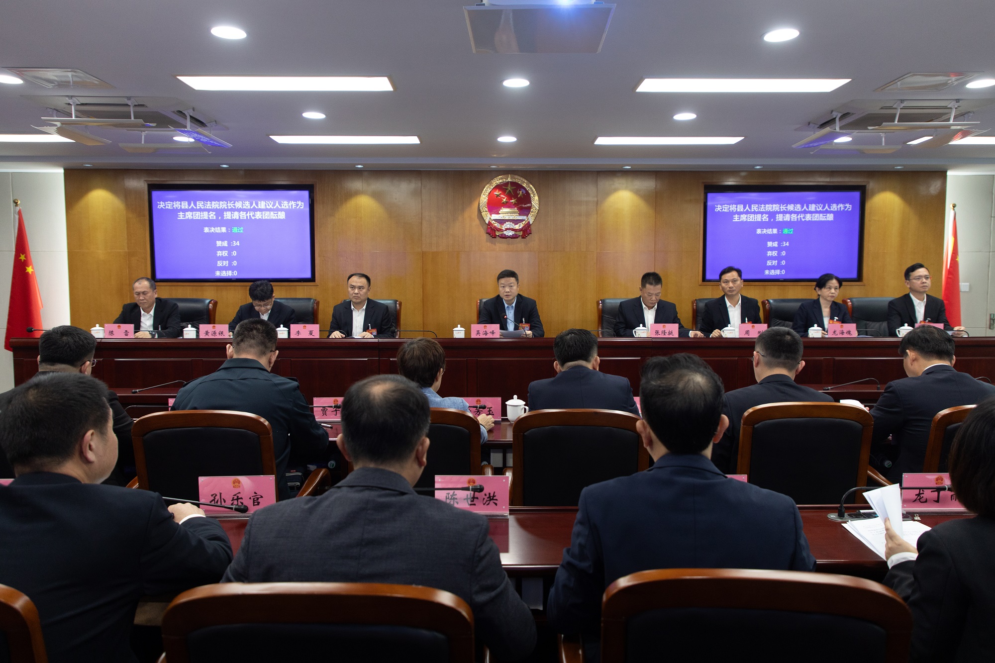 会议应到主席团成员35名,实到34名,符合法定人数。