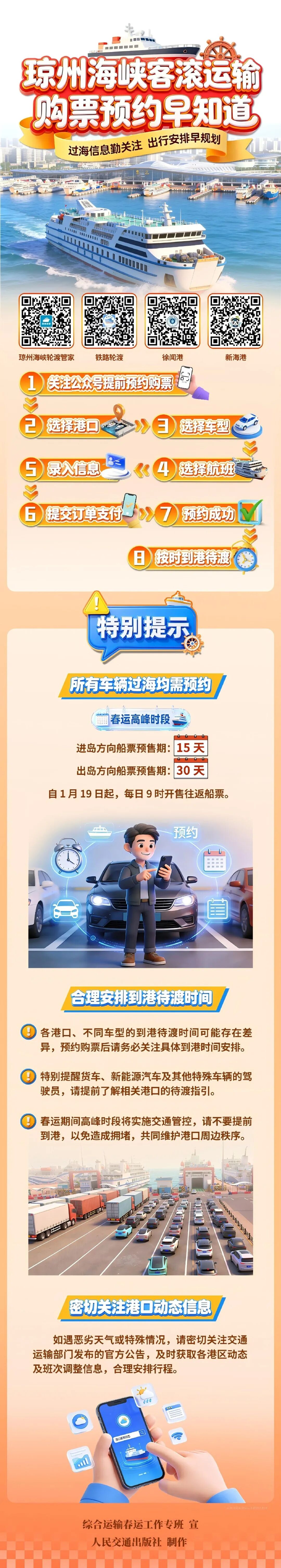 1. 提前购票+备好返程票 避开高峰更省心 春运期间船票预售时间调整 出岛方向(海口至徐闻) 可买到30天内船票 进岛方向(徐闻至海口) 可买到15天内船票 购票请认准官方渠道 “琼州海峡轮渡管家”“新海港” 微信服务号 “轮渡管家”客户端及小程序 港口线下不售卖小车过海船票 建议大家提前买好返程票 合理安排出行计划,避开高峰时段 2. 紧盯官方票务动态 合理规划日期 请大家密切关注 官方售票平台的余票情况 结合自身行程合理安排出行日期 售票平台将根据旅客退票情况 和运力调配进度 请持续关注官方平台放票信息 3. 善用候补功能 避免空跑耽误行程 若心仪航班的船票已售罄 可直接申请候补船票 系统将自动匹配合适的航班 候补成功后会第一时间通过短信通知 重要提醒! 未收到候补成功通知前 切勿直接赶往港口 避免空跑延误行程 4. 牢记进港规则 助您高效过海 琼州海峡执行 “小车提前购票 提前不超2小时进港”规则 出岛小客车以船票标注的 开航时间为计算起点 提前不超过2小时进港 提前超过2小时的小客车不能进港 🌪 关于货车出行的特别提示 近期 寒潮大风天气多发 货车进出岛通行效率受到一定影响 请广大货车司机朋友 一定提前预约过海 请密切关注天气变化 和官方发布的通行信息 合理安排出行时间 暂缓前往港口周边聚集
