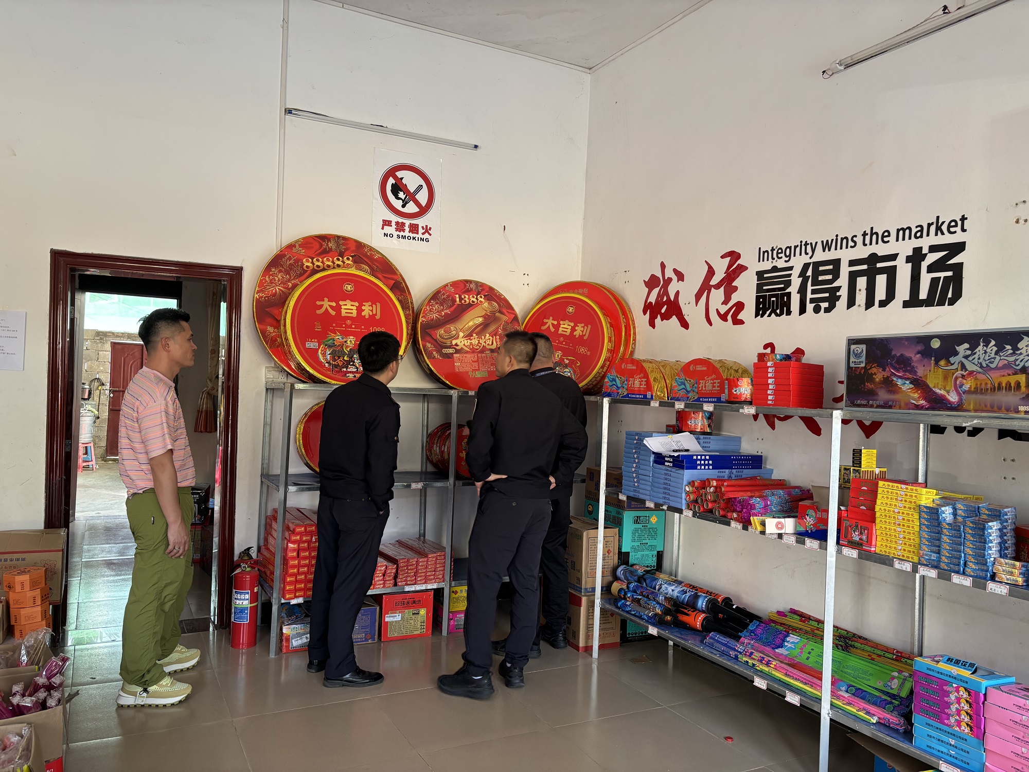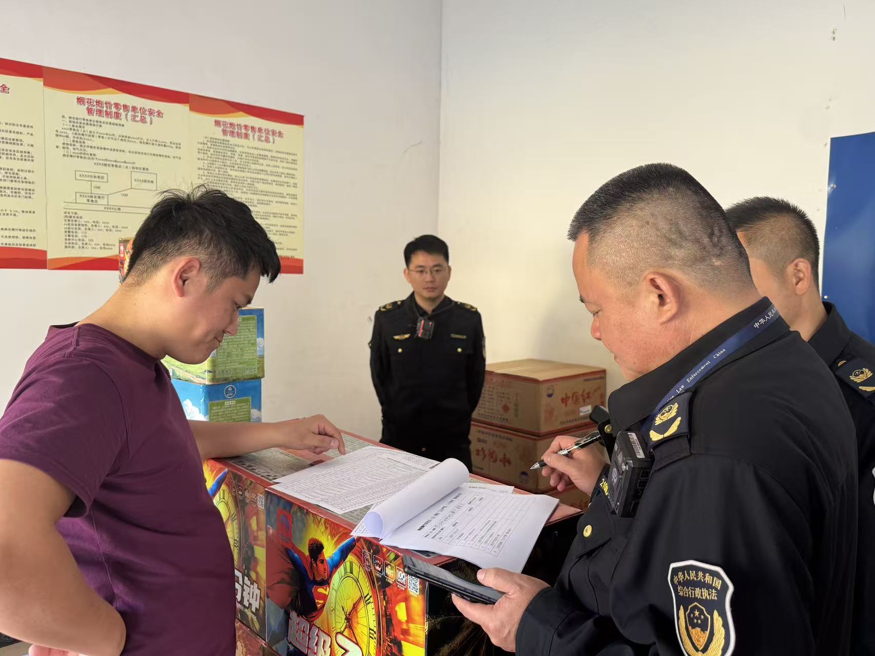 检查中,执法人员坚持“执法+普法”相结合,向经营业主讲解烟花爆竹安全管理规定,普及消防安全知识,提醒商户合法经营、规范存放。针对检查中发现的个别商户将烟花爆竹产品摆放至店外等行为,执法人员当场提出整改意见,并现场指导完成处置措施。