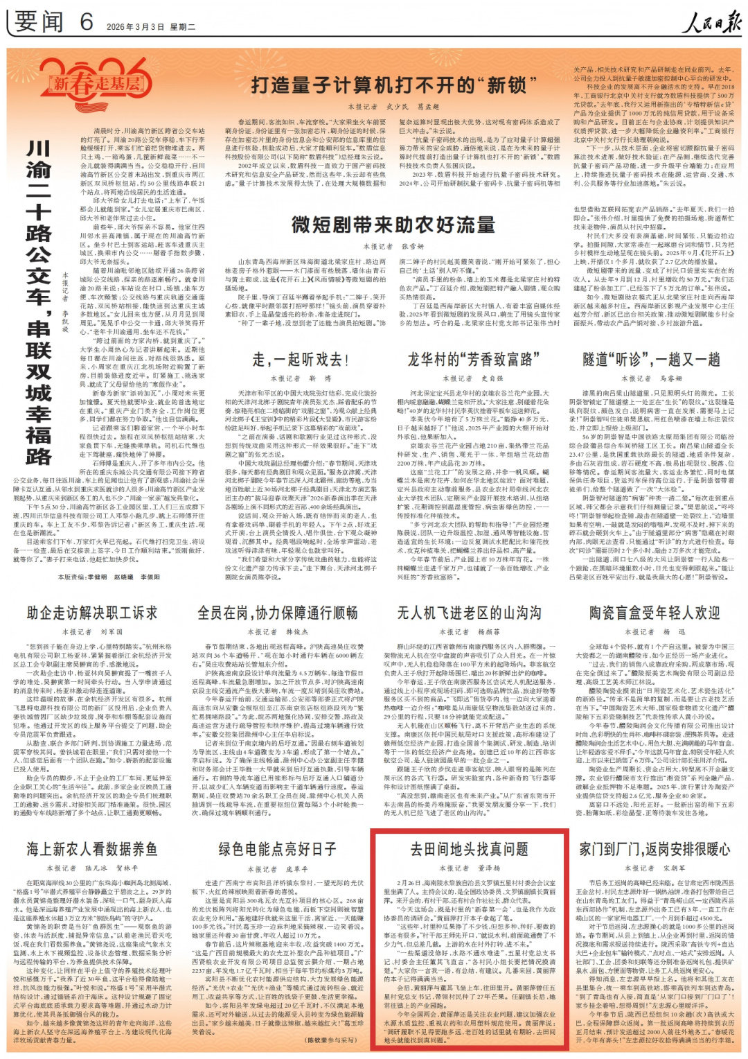 3月3日,人民日报第06版以《去田间地头找真问题(新春走基层)》为题刊发文章,以下为该版面图及文章全文内容: