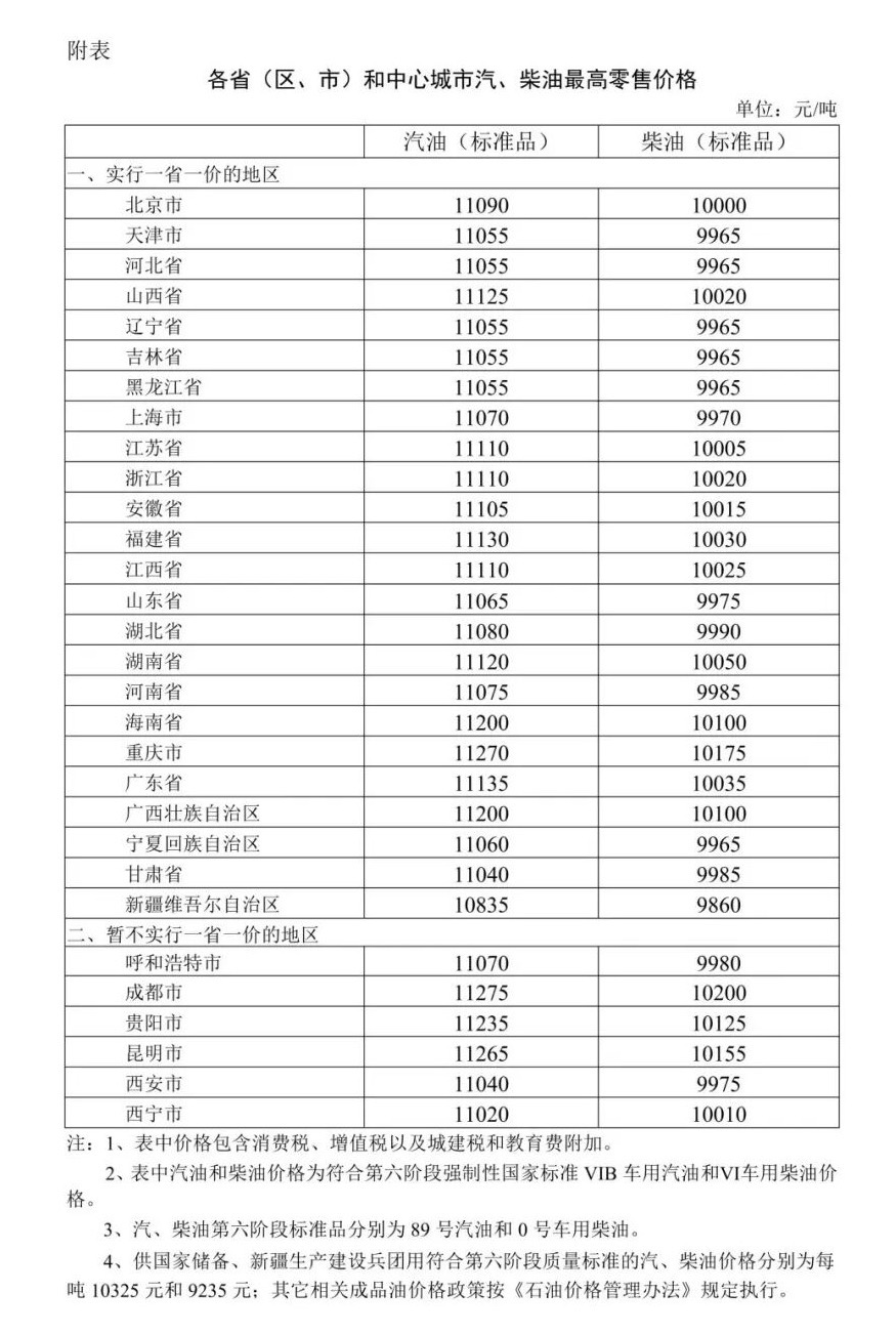 附:各省(区、市)和中心城市汽、柴油最高零售价格