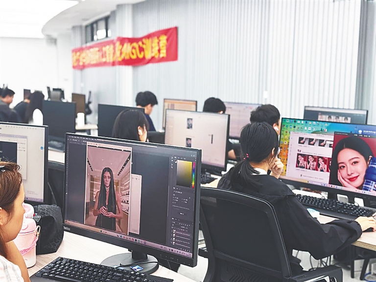 走进海南软件职业技术学院陵水数字创意学院的一间教室,电脑屏幕上,学生们正在利用可灵等AI平台,生成外国模特面孔的彩妆产品展示视频,一旁,企业导师手把手指导。这是该学院与阿里国际合作开设的AIGC人才孵化训练营。